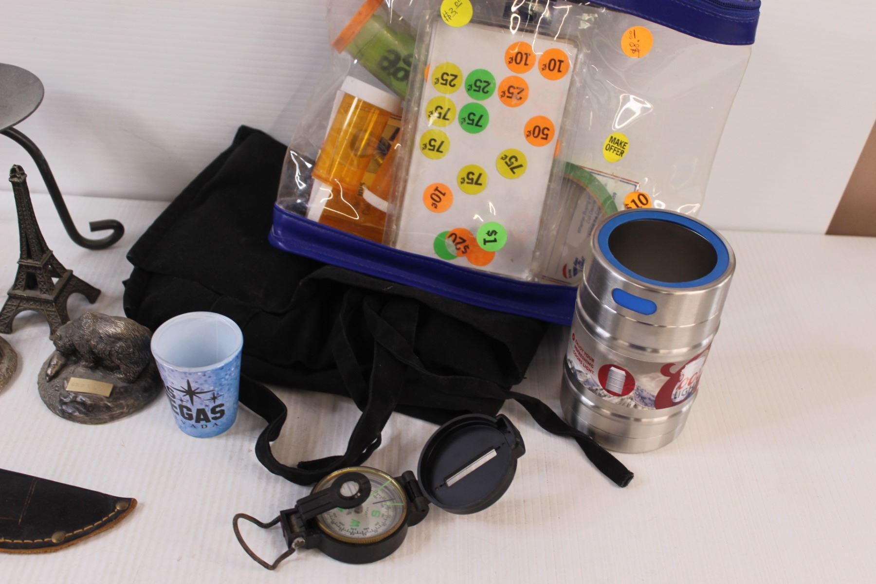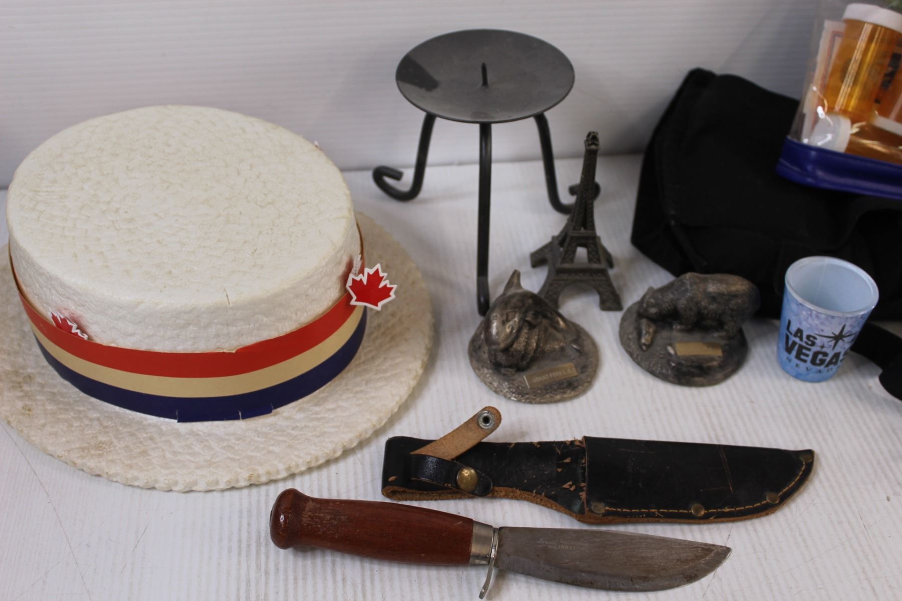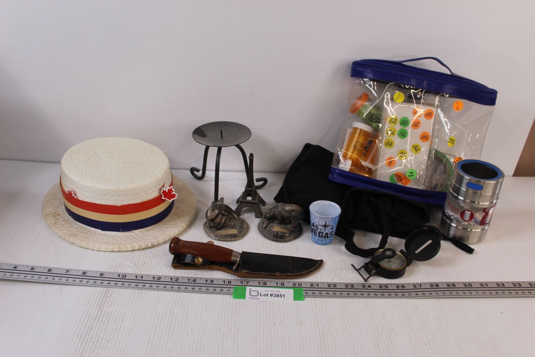 Lot of: Hunting Knife, Politician Hat, Metal Landmark Desk Decor, Compass, Misc.