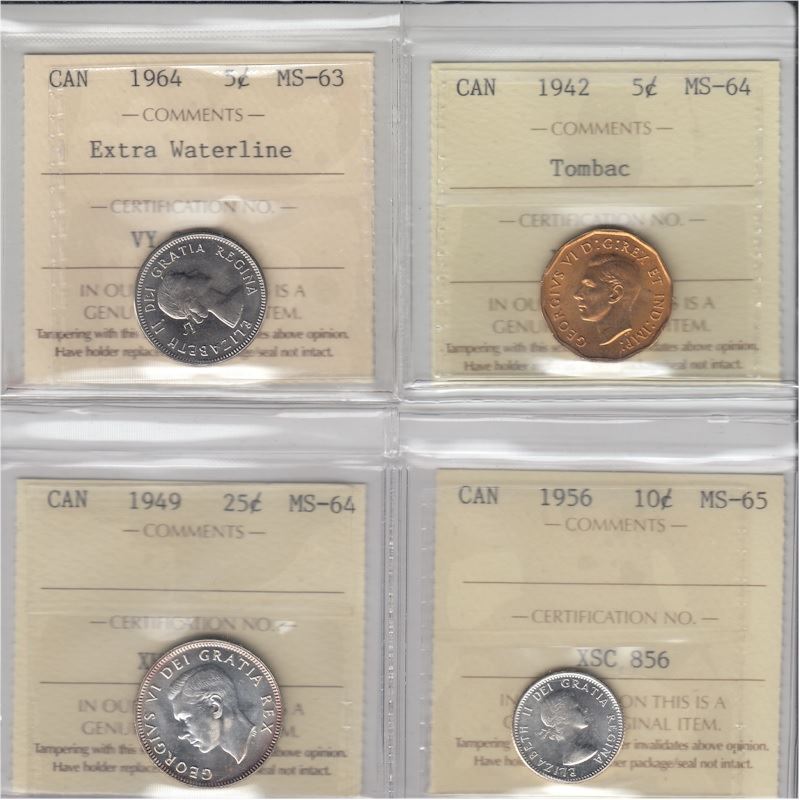 Lot of ICCS Coins. Lot includes: 1942 tombac 5-cent MS64, 1964 5-cent EWL MS63, 1956 10-cent MS65, & 1949 25-cent MS64 (2 toned, dark reverse and bright obverse) Trend value of lot: $320