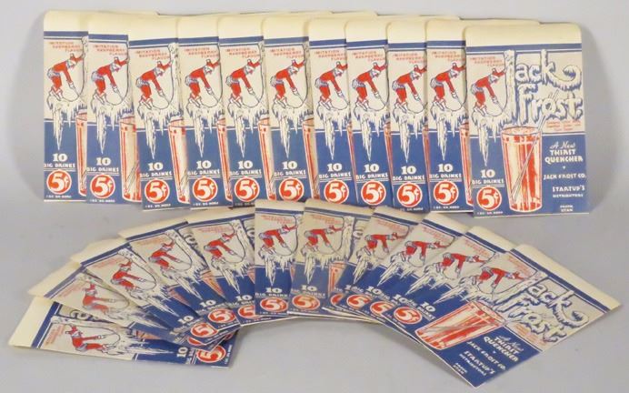Lot of Jack Frost Beverage Mix Packages and die cut cardboard price sign. (22) NOS packs. 3 1/2 X 5 3/4 inches.