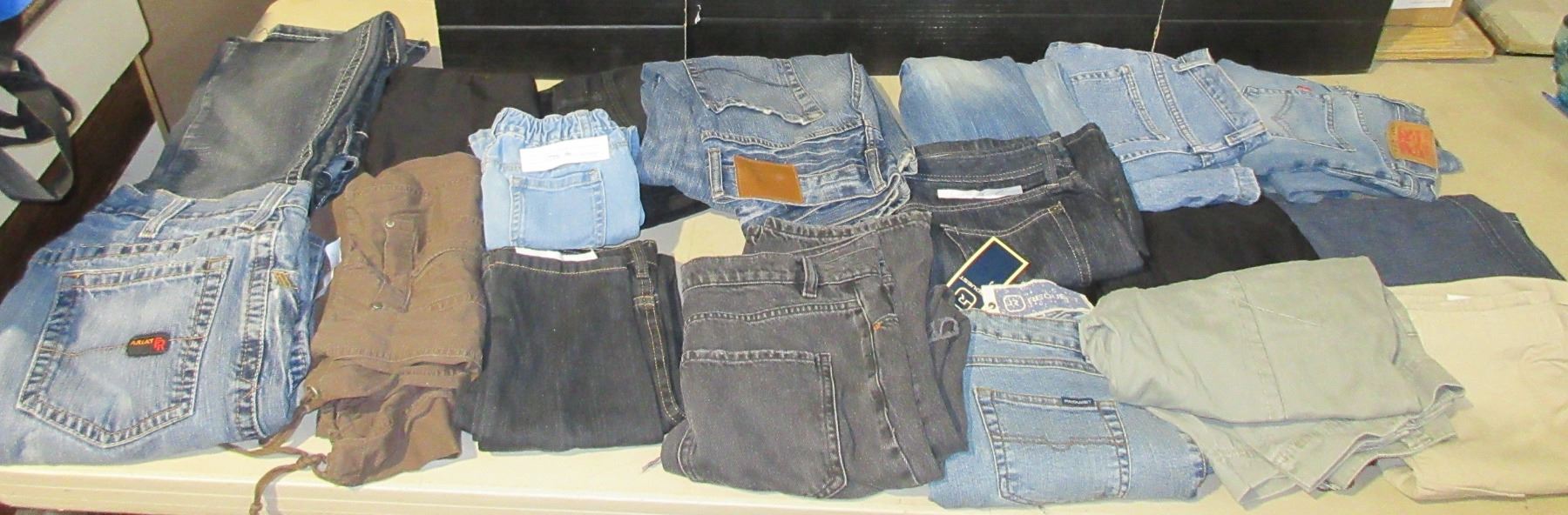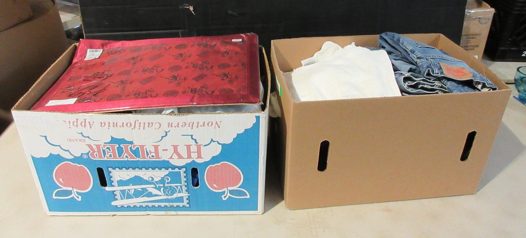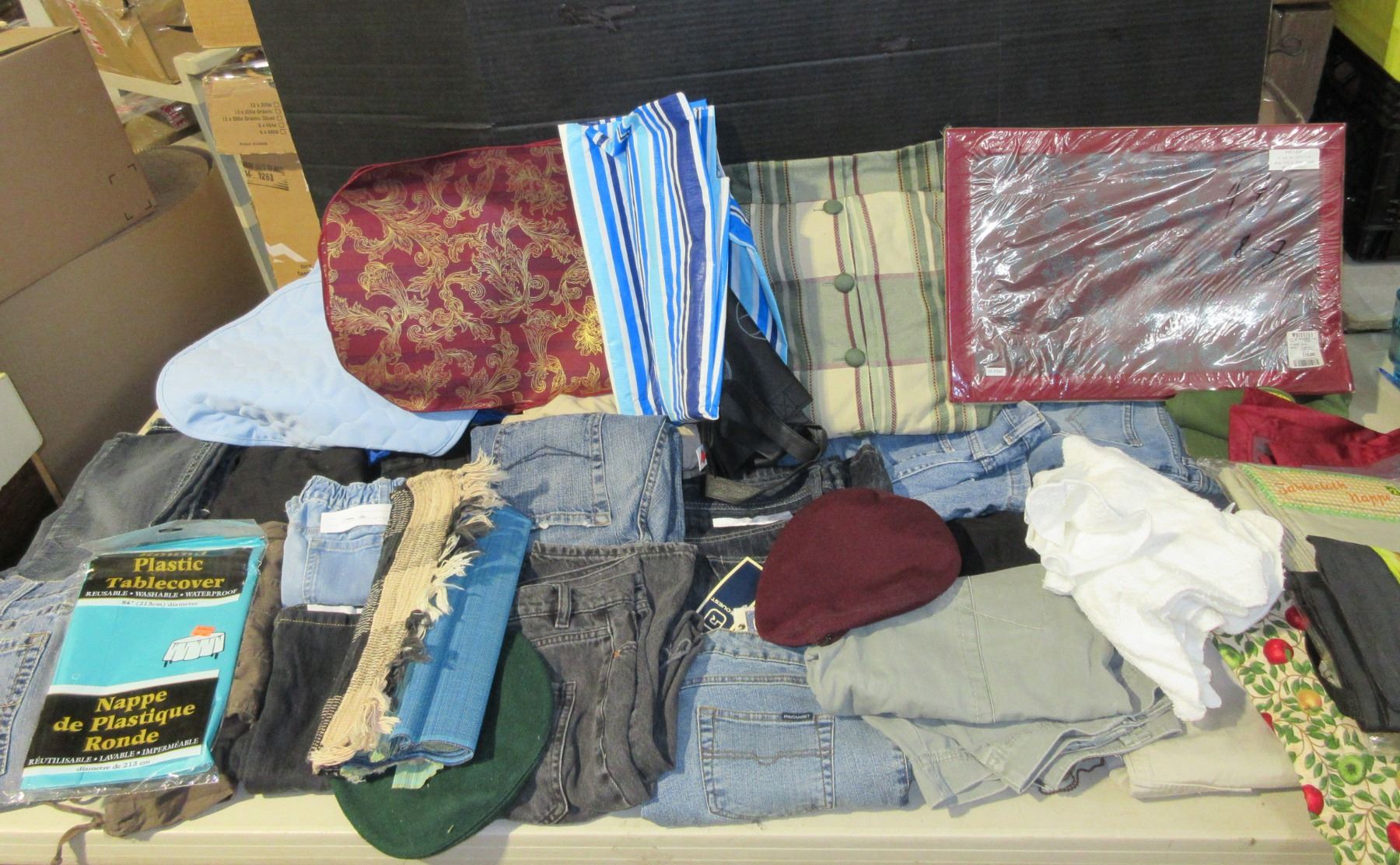 Lot of Jeans (Various Sizes of Kids Included 6, 7, 8, 8 etc, Some Adult Also), 7 Cotton White Handkercheif (New), (2) Tablecloth (New), (4) Caps (Two from Scouts Canada), Etc.