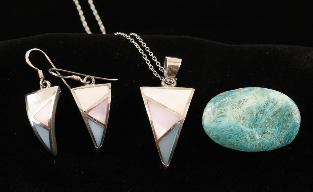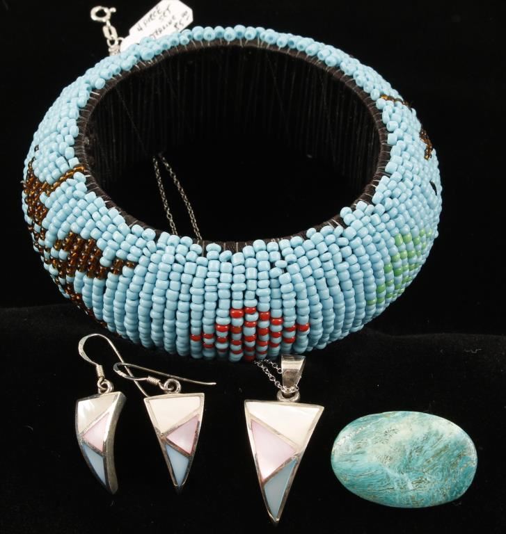Beaded Bracelet, Sterling Inlaid Pendant and with matching earrings, Turquoise Stone Loose.