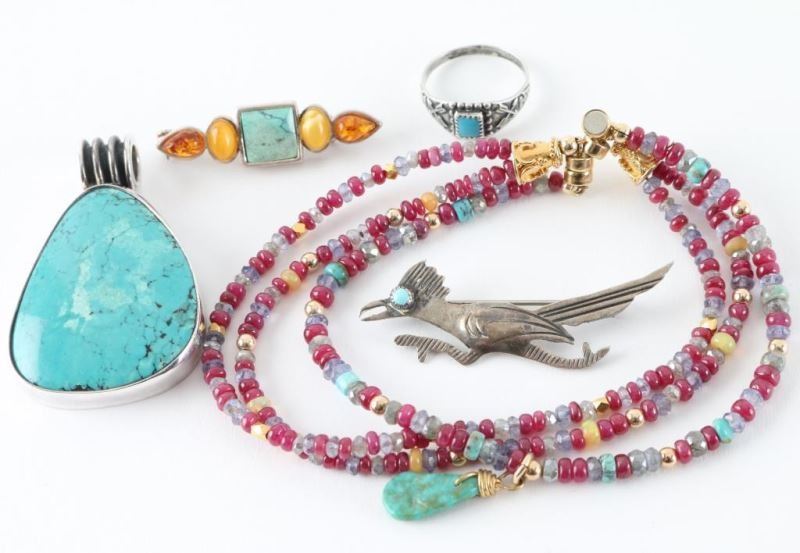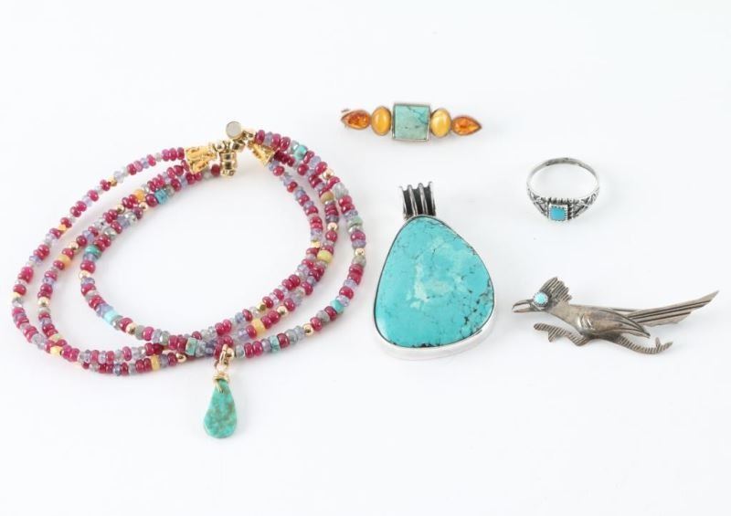 Including Turquoise and Sterling Pendant , Two Ruby and Turqiouse beaded bracelets. Sterling "Fred Harvey" Style ring. An Amber and turquoise pin , also a sterling sliver Road Runner pin.