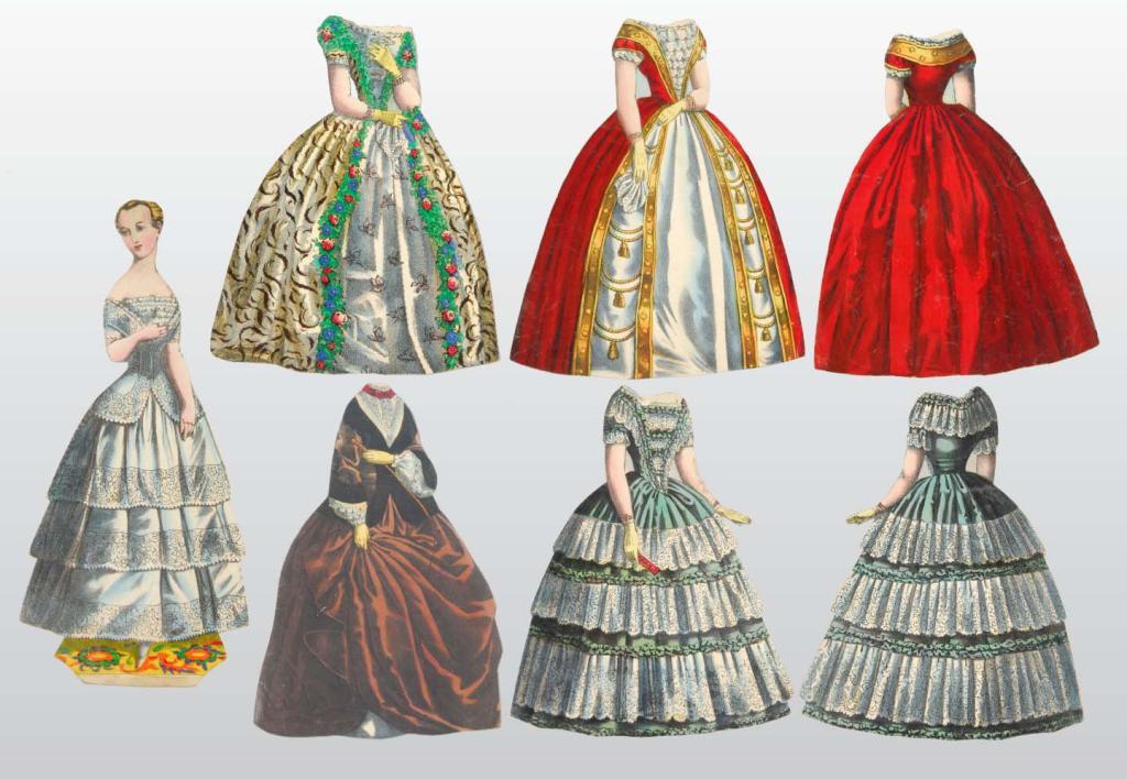 Description Circa 1850s. Two exquisite, identical front/back reinforced 9.75-inch ladies. There are nine front/back hand painted gowns, one shawl, and two hats. All have egg wash embellishment. Beautifully detailed clothing, vivid colors and in near mint condition.