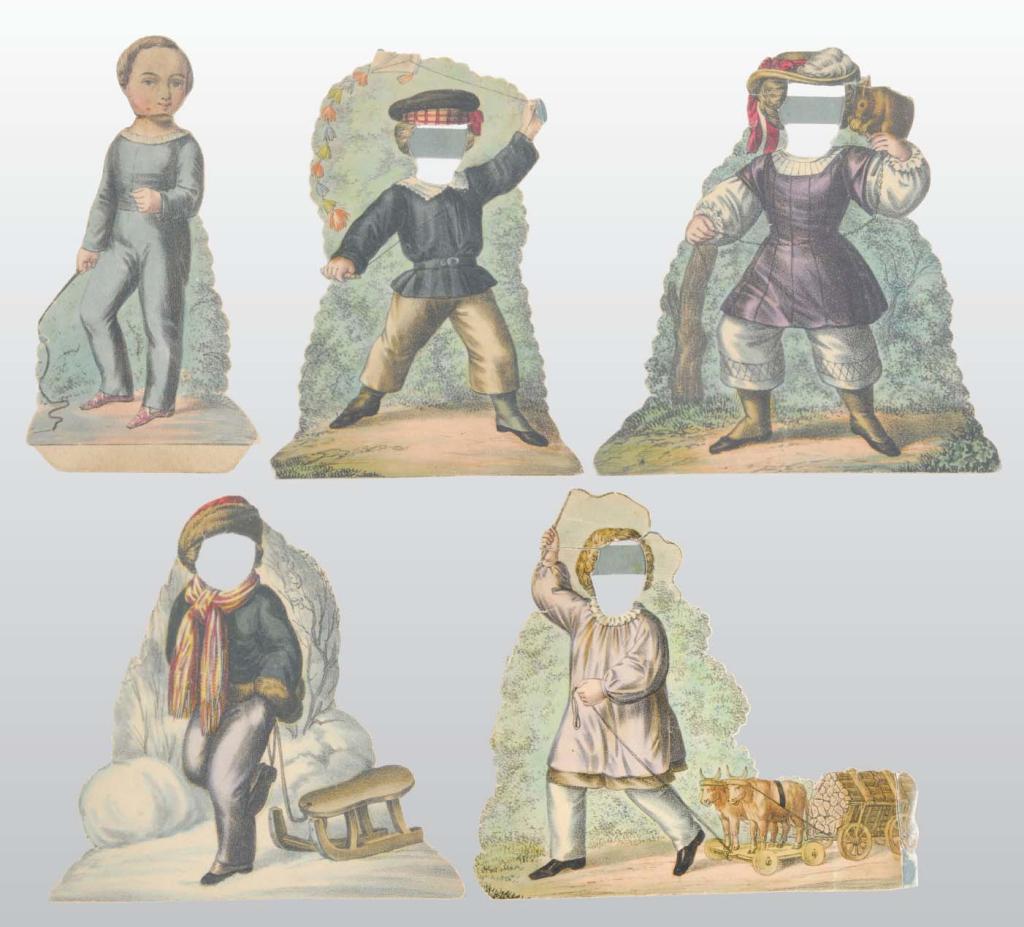 Description Circa 1840. The light colored "Boy" is 5.5-inches tall with metal reinforcement and a repaired neck. He has six hand colored, paper backed costumes with egg wash embellishment. The doll and outfits have new backing. The damage to several outfits includes breakage and paper loss. The set is in good condition.