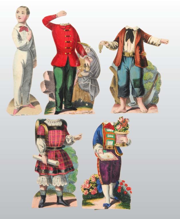 Description Circa 1840. A reinforced 7-inch doll on cardboard with four outfits depicting activities of the period, and four hats. Hand coloring, egg wash and strong color. The set is in excellent condition.