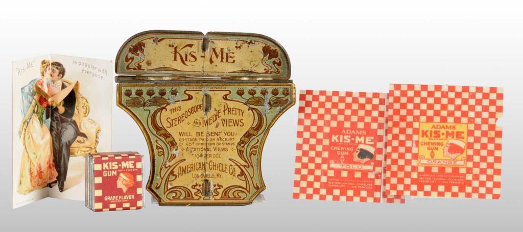 Description Includes nice stereoscope with one card circa 1910, one full pack of grape gum, and three separate sticks of gum circa 1920, two individual wrappers are orange and Tulu. Also includes one interesting card that opens and fan pops out showing Kis-Me gum, circa 1890. On stereoscope someone has scratched the initials "ER" into it but this does not distract from piece. Condition (Good - Excellent).