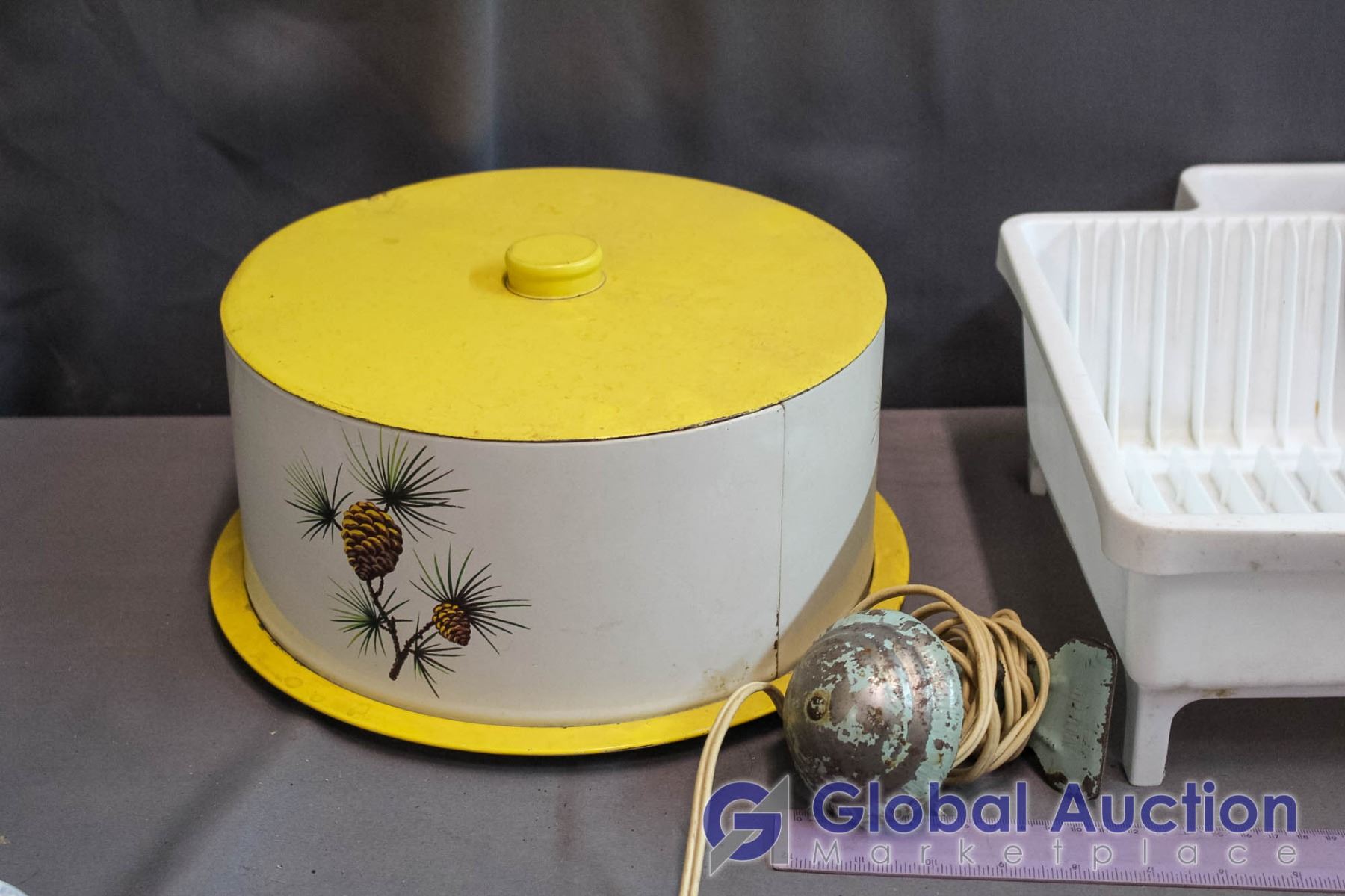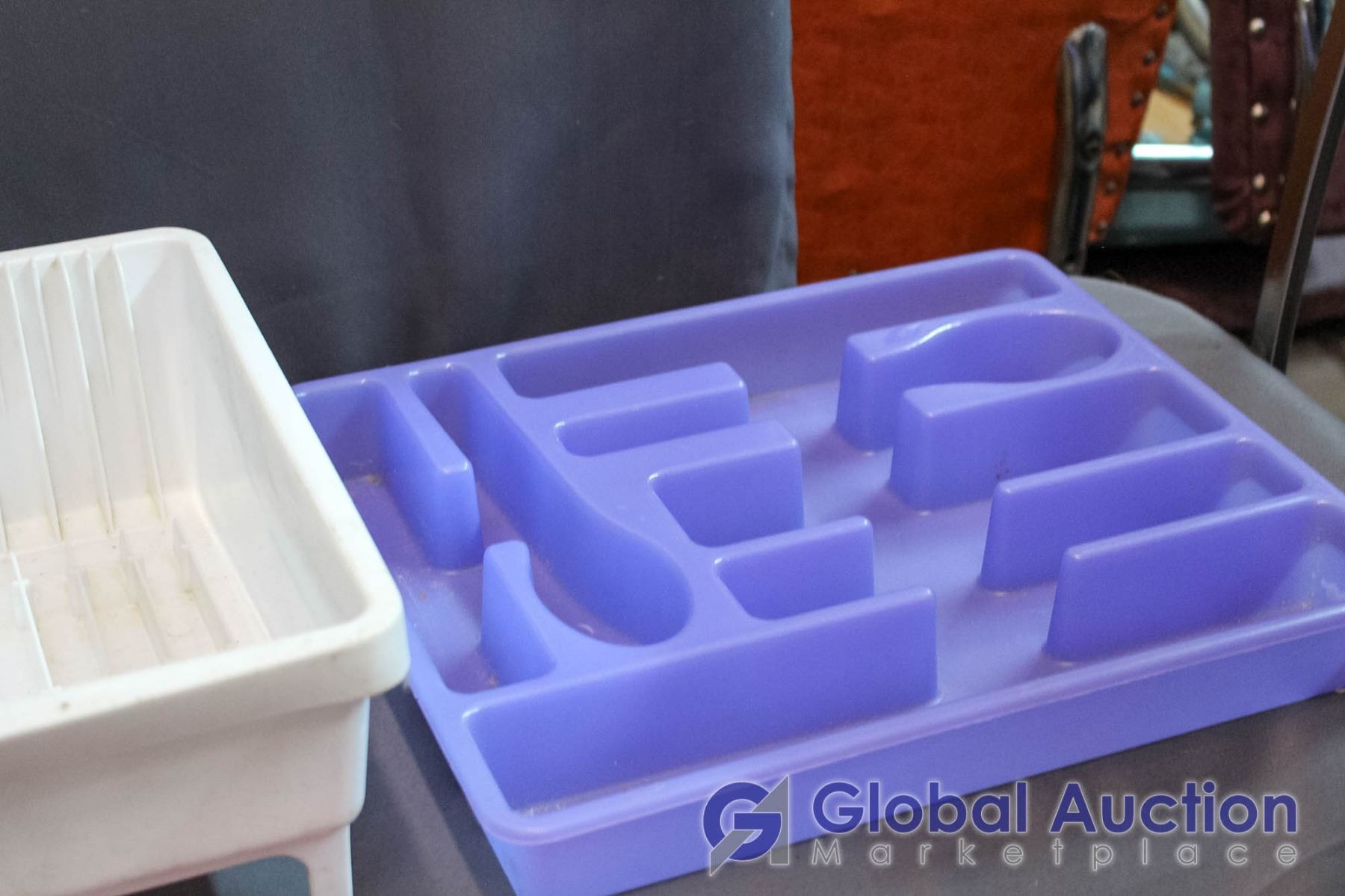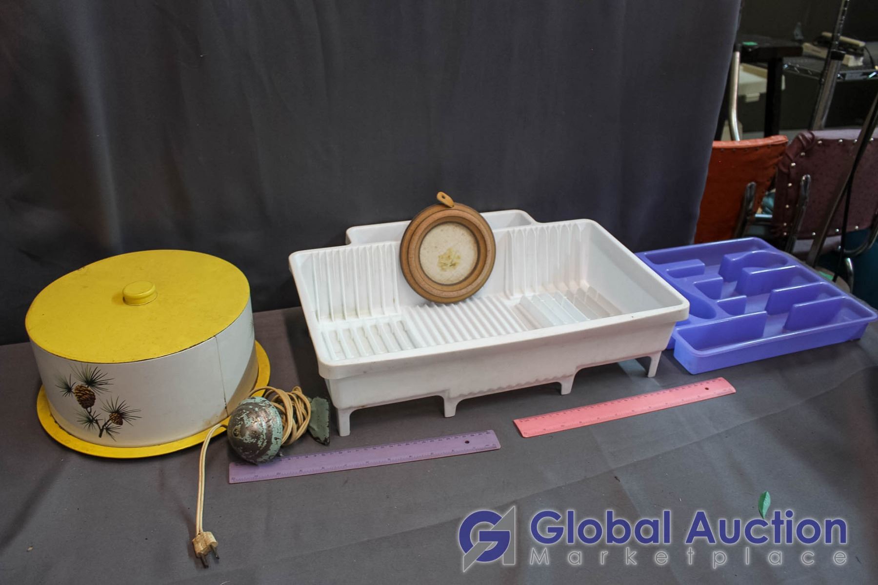 Lot of Kitchen Organization, Dish Rack, Covered Cake Pan, & Misc