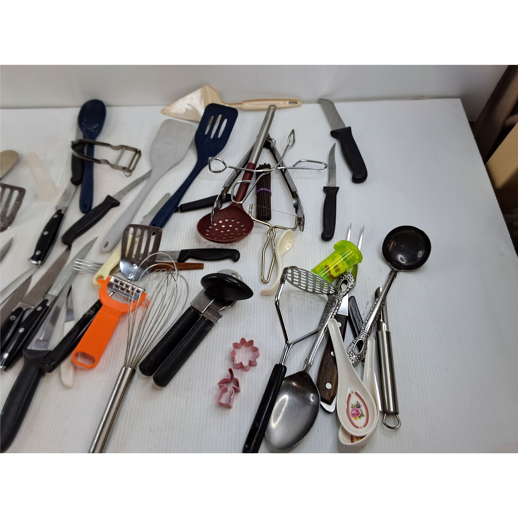 Lot of Kitchen Ware, Knives, Spatulas, Cookie Cutters, Misc