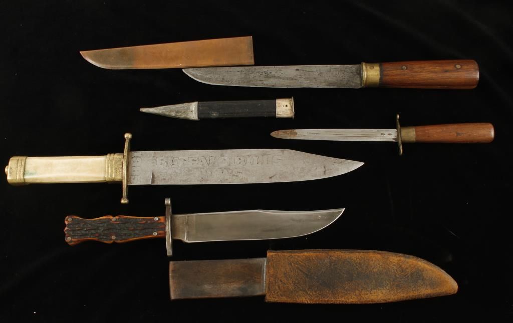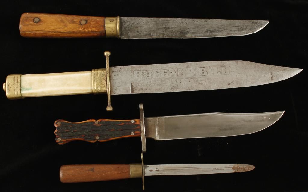 (1) Reproduction Bowie Knife 1960-to 1970's. Marked "Buffalo Bills Wild West Shows". Type made in England. (1) Handmade reproduction 19th century bowie knife with stag handle. Reproduction Indian style knife with copper sheath. (1) antique unmarked knife with wood handle. And (1) other.