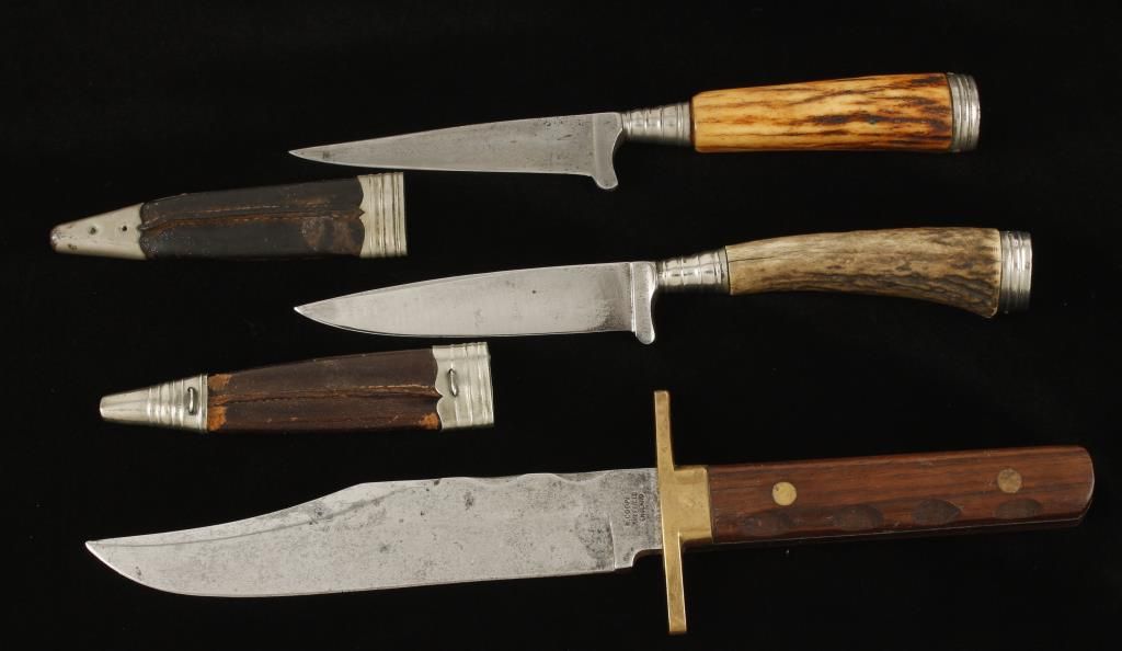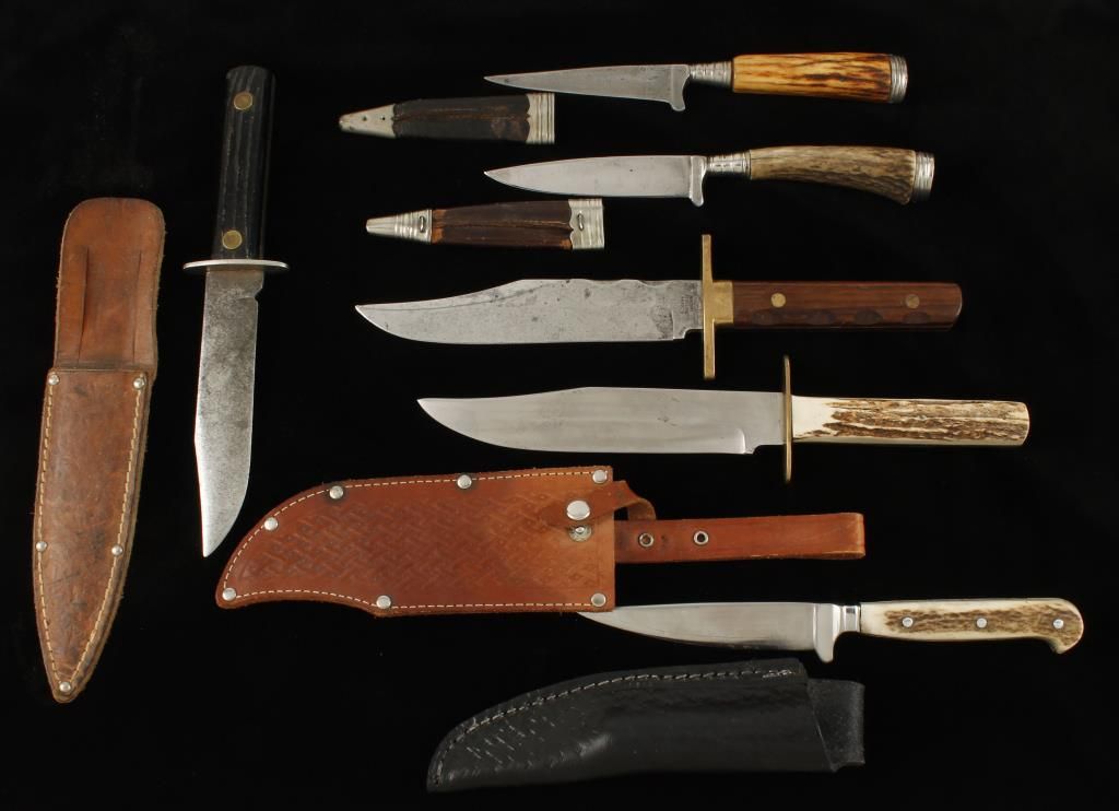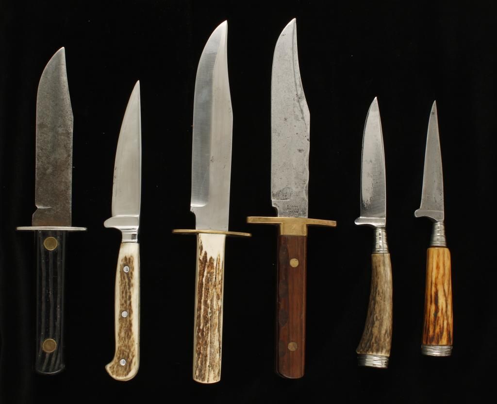 German and English style hunting and sheath knives. (1) Marked "R Coupe Sheffield England" with wood grip in good condition. (3) Small German style hunting knives with scabbards and unmarked blades. Prewar. (1) Unmarked English export style post 1900. Fair condition. "IERV" marked with stag grip. Pre WWII. And (1) other.