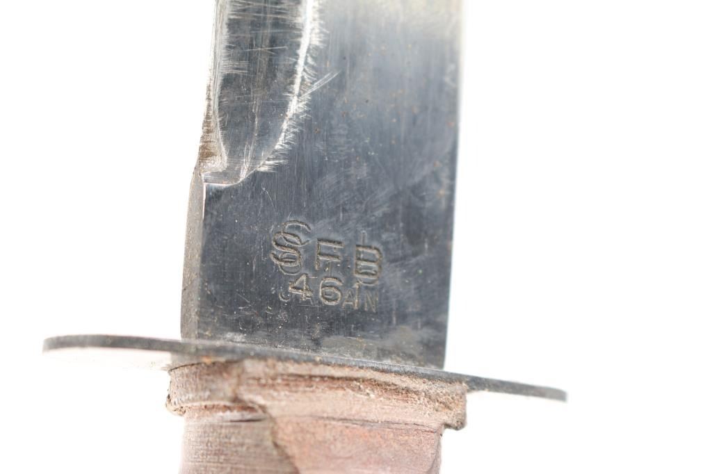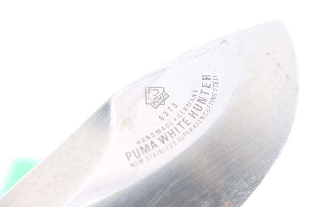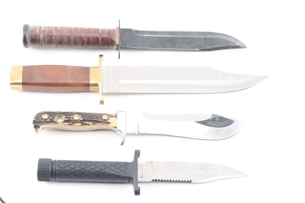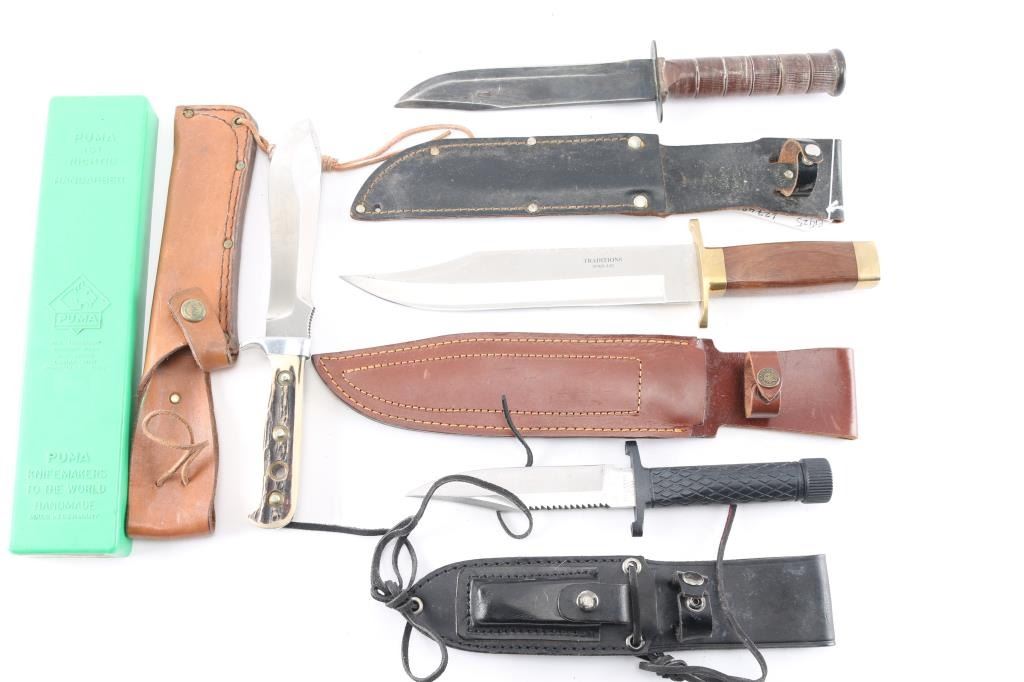 Four total. 1 - Puma White Hunter 6375, made in Germany, 6" stainless steel blade full tank, stag handle w/steel rivets, comes w/brown leather sheath and plastic factory box; 1 - KaBar made in Japan, 7" blade marked "SFB 461" on ricasso, comes with black leather sheath; 1 - Bowie style w/9" 440 stainless steel blade marked "Traditions Spain 440" on left side, brass guard and pommel, comes w/brown leather sheath; 1 - Explorer Survivor - I made in Japan, 5 1/2" 440 stainless steel blade, aluminum guard & screw on pommel, hollow handle compartment for matches, etc...comes w/black leather sheath and sharpening stone. All in good condition.