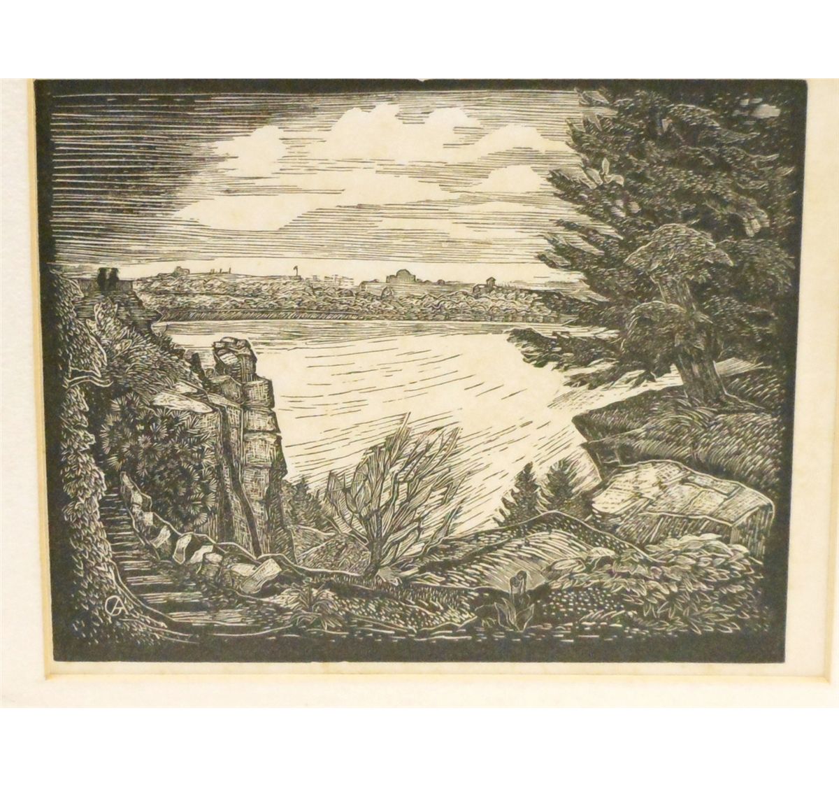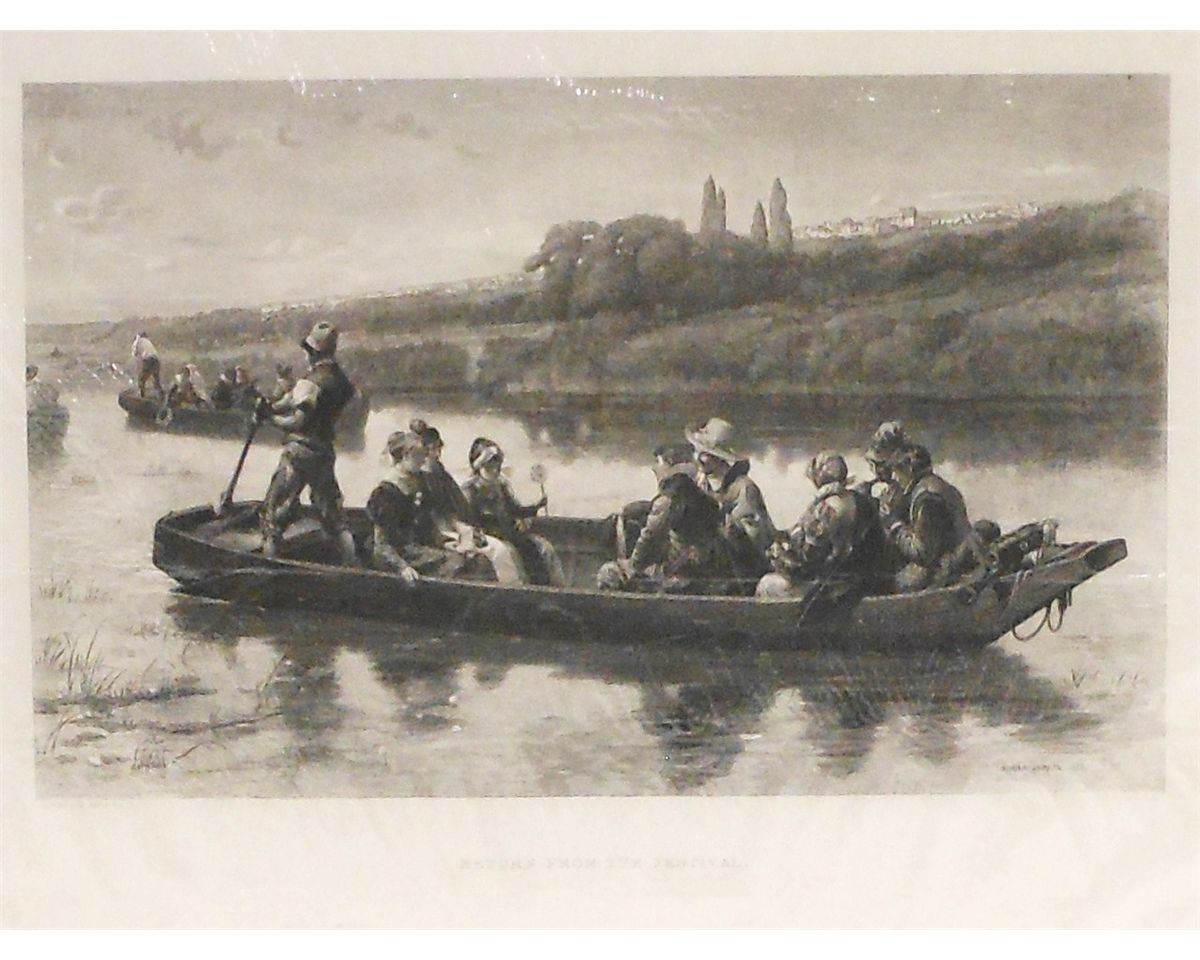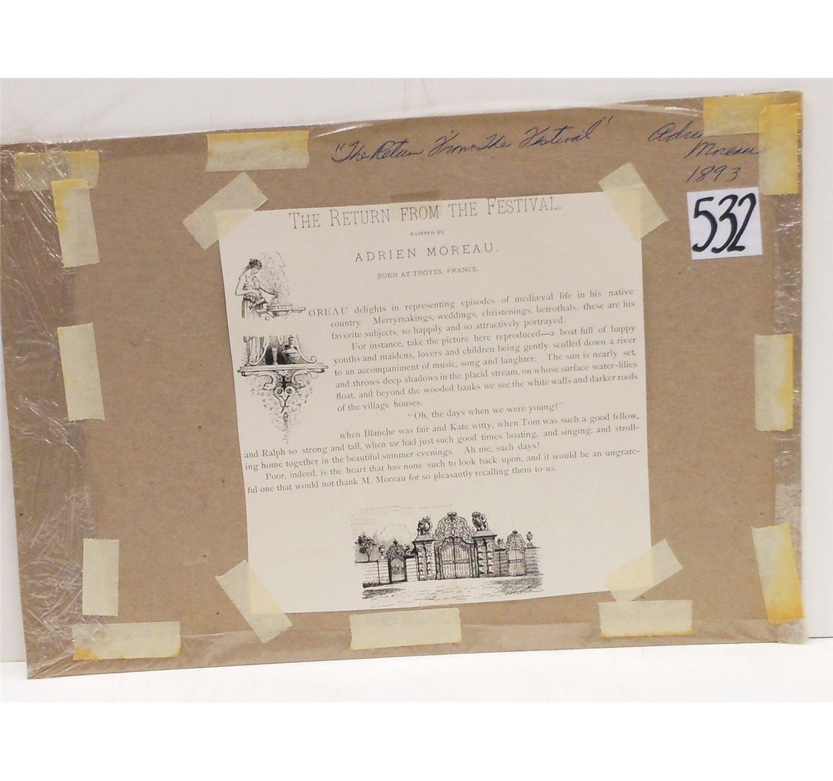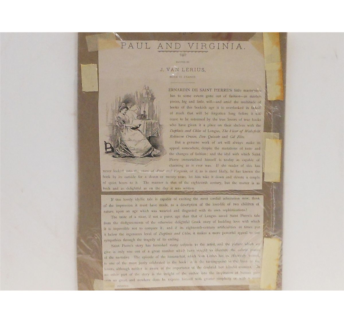 Lot of five. 4 3/4" x 7 3/4" etching dated 1850 of Frankfurt. Two 5 1/2" x 7 1/2" etchings signed GA. 7" x 10" litho by Adrien Moreau titled "return From the Festival". 8 1/2" x 11" litho by J. Van Lerius titled "Paul & Virginia". Some have provenance on verso. All are in good condition.