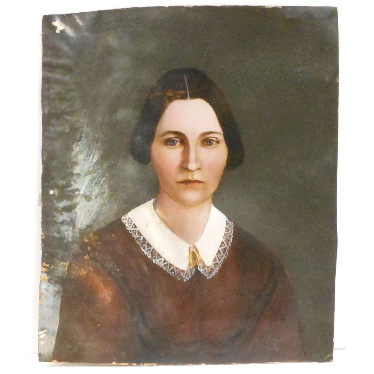 Lot of two. 16" x 21" oval portrait in pastels, unsigned and has some edge damage and loss. 10" x 12 1/2" oil on board portrait with damage.