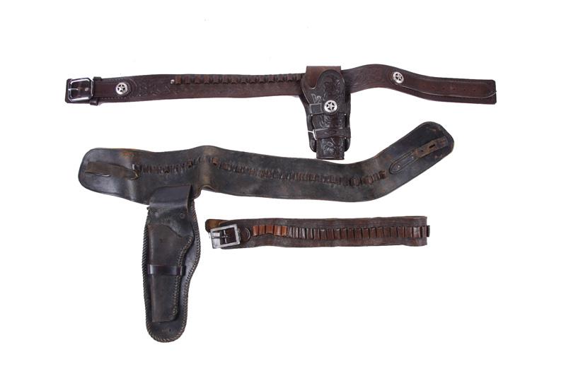 Lot of Leather Ammo Belts and Holsters Consists of 3 ammo belts, 2 with matching holsters. 2 belts show lots of use and are much older. The third one is a double strap near new rig, showing nice star conchos, and nice tooling on the belt and holster.Consists of 3 ammo belts, 2 with matching holsters. 2 belts show lots of use and are much older. The third one is a double strap near new rig, showing nice star conchos, and nice tooling on the belt and holster.