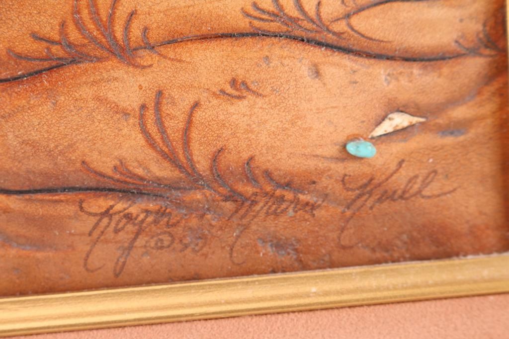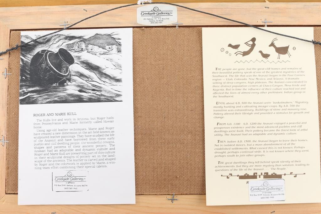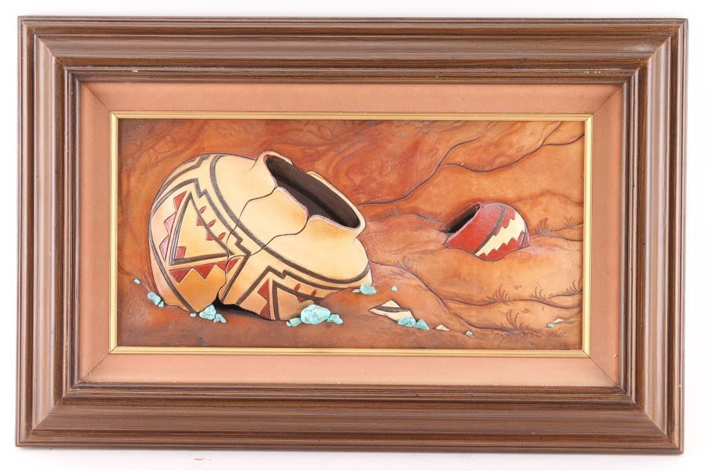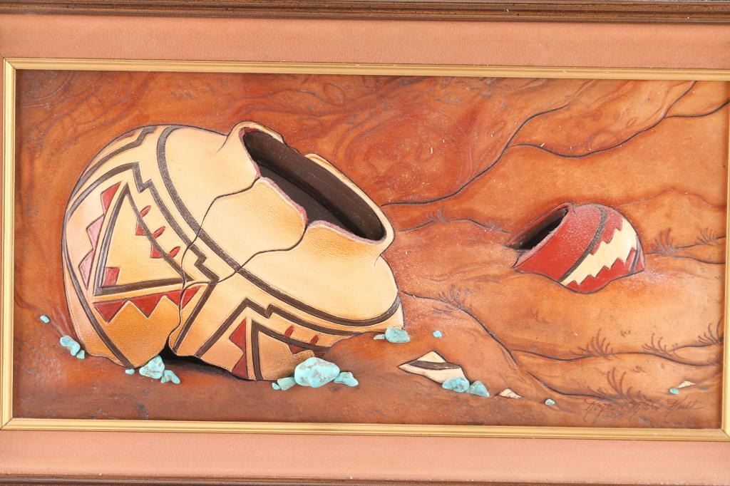 Artwork of Native American pottery on leather by Roger and Marie Kull. 23" x 15"