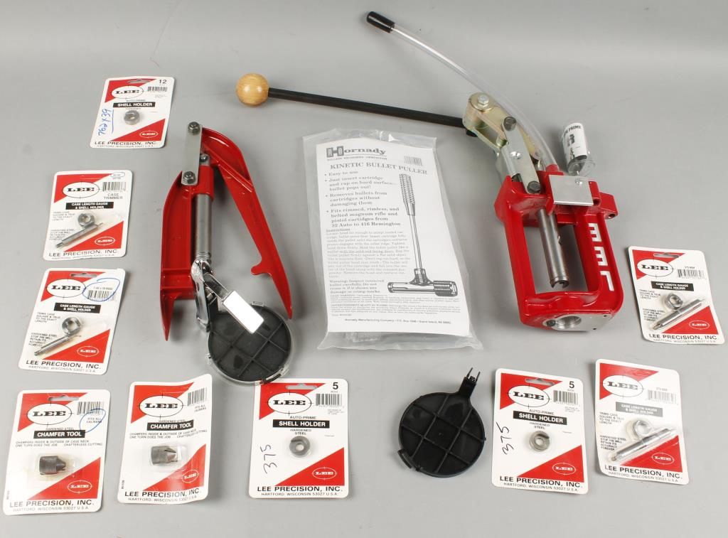 Includes: Lee reloading press, numerous shell holders, kinetic bullet puller, Lee handpress,and more.