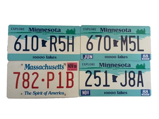 3 Minnesota state cardboard license plates and 1 Massachusetts state white, red and blue cardboard license plate. Used in various movies and TV shows. From the Debbie Reynolds/Todd Fisher studio archives.