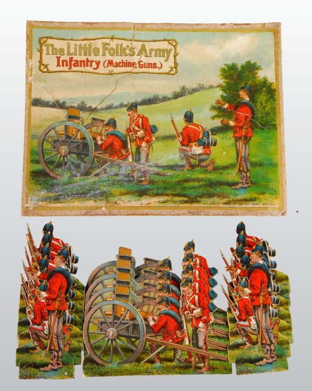 Description ND. This colorful McLaughlin set has eighteen soldiers on wooden stands, loading rifles and firing machine guns. The infantry ranges in size from 3.5" to 5.5" and is in excellent condition. The box is damaged and pieces are broken off the cover.