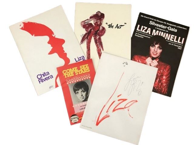 Lot of Liza Minnelli programs. One is about her life and signed on the front in blue pen with a happy face. Includes several photos of her fim and music career including a centerfold photo. Published by Raydell Publishing. Also includes musical programs from The Act, The Rink, Come See The Stars, and the Silvester-Gala in Germany 1982.