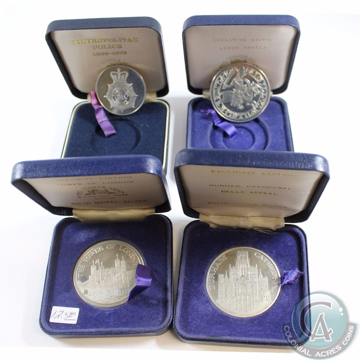 Lot of London Nickel Silver Medallions in Original Clamshell cases. You will receive the following medals, Leeds Castle, Tower of London, Metropolitan Police, and Durham Cathedral. 4pcs.