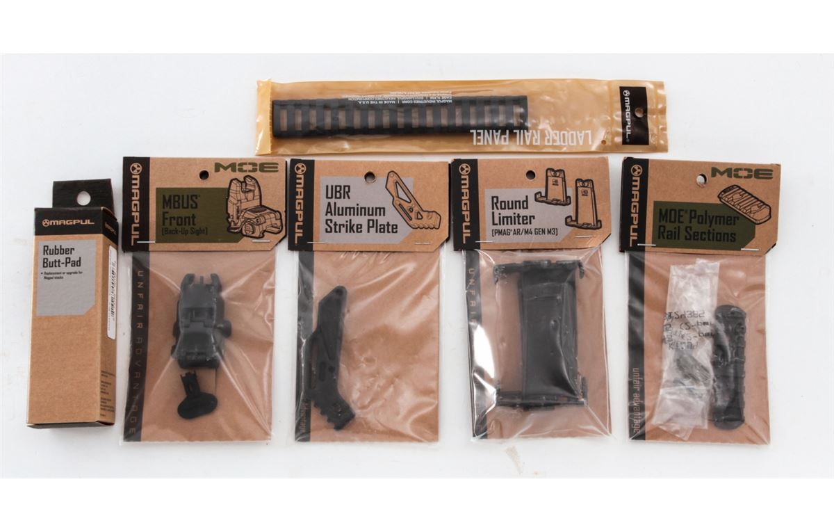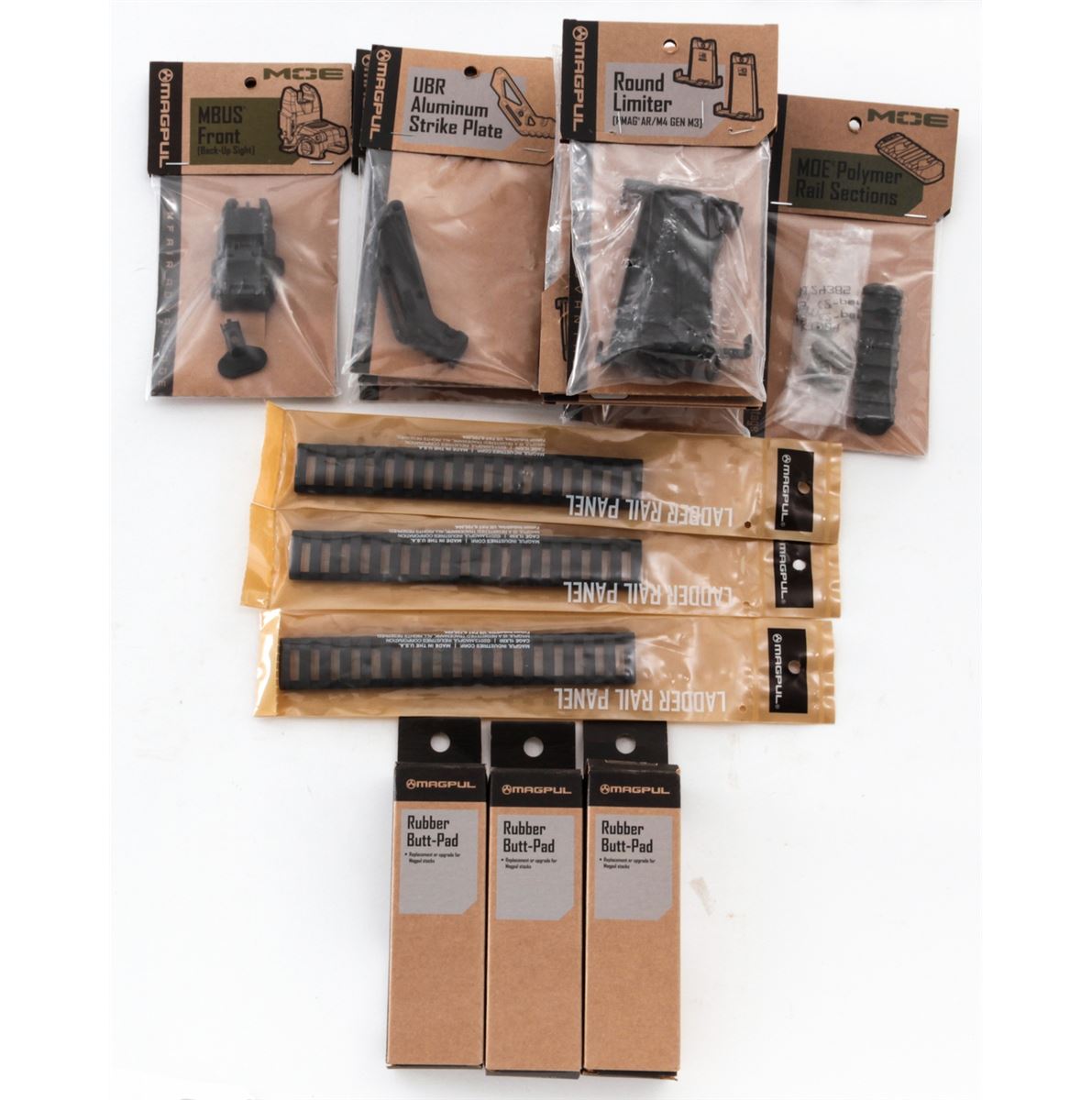 Lot of Magpul Products: Four (4) Round Limiters (PMAG AR/M4 Gen M3); three (3) UBS Aluminum Strike Plates; MOE Polymer Rail Sections; three (3) MAG317 Black Rubber Butt Pads; MBUS Front (Back-Up Sight); and three (3) Ladder Rail Panels. All brand new in original packaging. Retails @ $250/lot. Est.: $150-$200/lot. (Field Time)