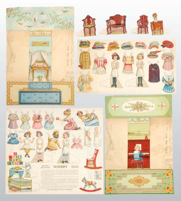 Description Dated 1911. This group of four 13" x 11.5" uncut, shrink wrapped sheets includes the Nursery, the Bedroom, the Dining Room and the Bathroom. This lot also includes many cut and partially cut pieces from other rooms in the house. The uncut material is near mint; the cut items have light wear and age.