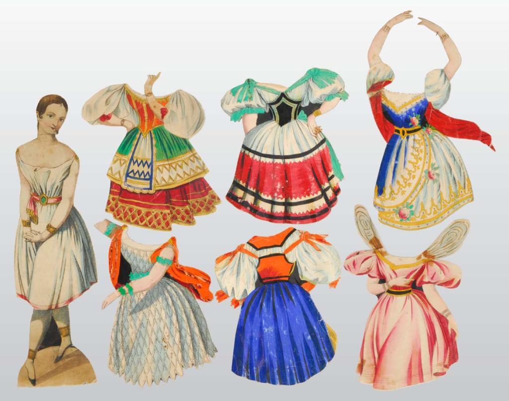 Description Circa 1830s. The front/ back 8.75-inch doll has a broken neck repaired with tape, ankle bends, foxing and soil. Daughter of a ballet master, Marie's clothing portrays the characters in her starring roles. The six front/ back costumes include outfits from "La Sylphide", "Sleeping Beauty" and "William Tell". One costume is missing an arm, another has been taped. All show wear, aging and soil. The set is in fair/ good condition.