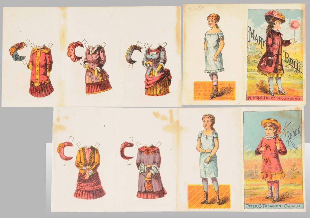 Description Two uncut five panel folders published by Peter G. Thomson. Each doll has three outfits and three hats. Despite wear, staining and age, these dolls are in very good condition.