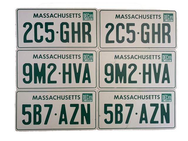 Massachusetts state white and green cardboard license plates. Set of 3 pairs (6 total). Used in various movies and TV shows. From the Debbie Reynolds/Todd Fisher studio archives.