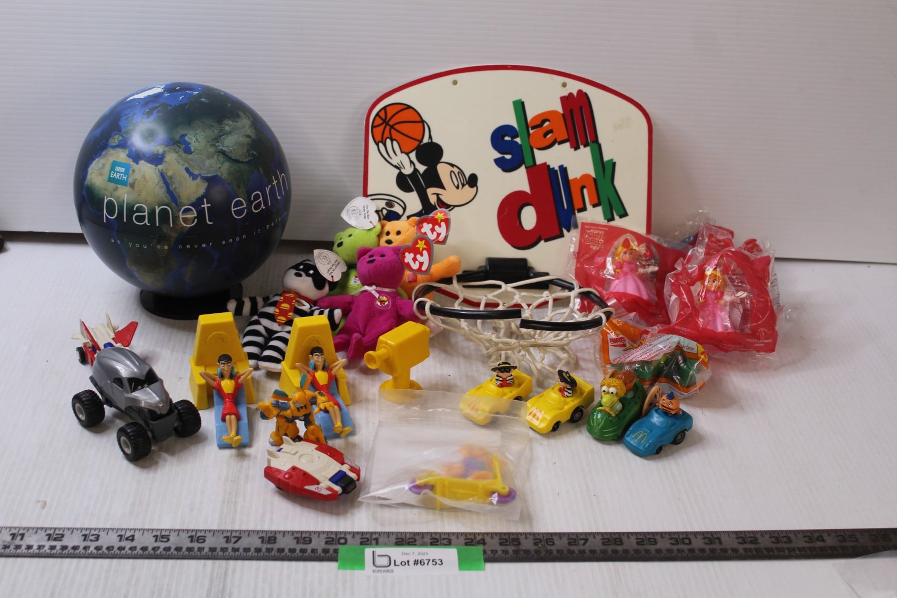 Lot of: McDonalds Happy Meal Toys, BBC Planet Earth Globe, Mickey Mouse Mini Basketball Hoop (Hoop Rim Damaged), Beanie Babies (McDonalds Variety)