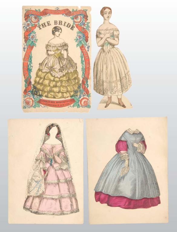 Description ND. The 5.25-inch "Bride" has a folder cover and five uncut gowns and four headdresses on twelve panels. The front/back doll and clothing are elaborate and beautifully painted. This is a rare set and a wonderful example of an early paper doll.