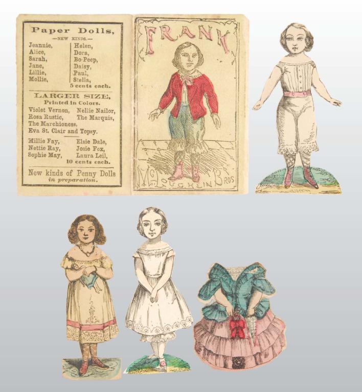 Description ND. This group includes "Lucy", "Frank", "Jenny", "Dolly", "Willie", and "Little Fred." No set is complete. The dolls and clothing are in excellent condition and show average age and wear.