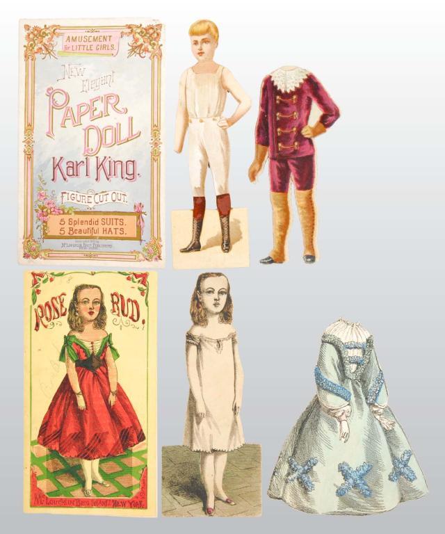 Description ND. "Minty Green", "Laura Neil", "Esther Fine", "Rose Bud", "Karl King", and a headless "Madame Pompadour". There are three outfits for "Flora Fair," but no doll! No set is complete. The dolls and clothing are good condition with average age and wear.