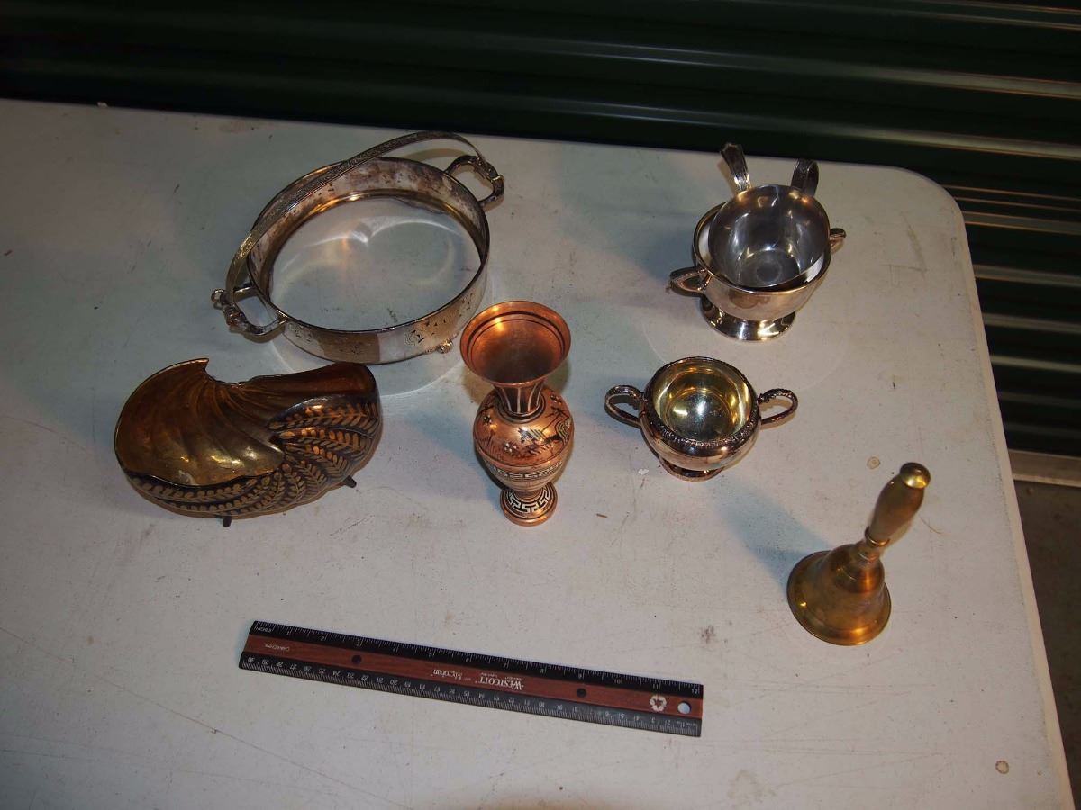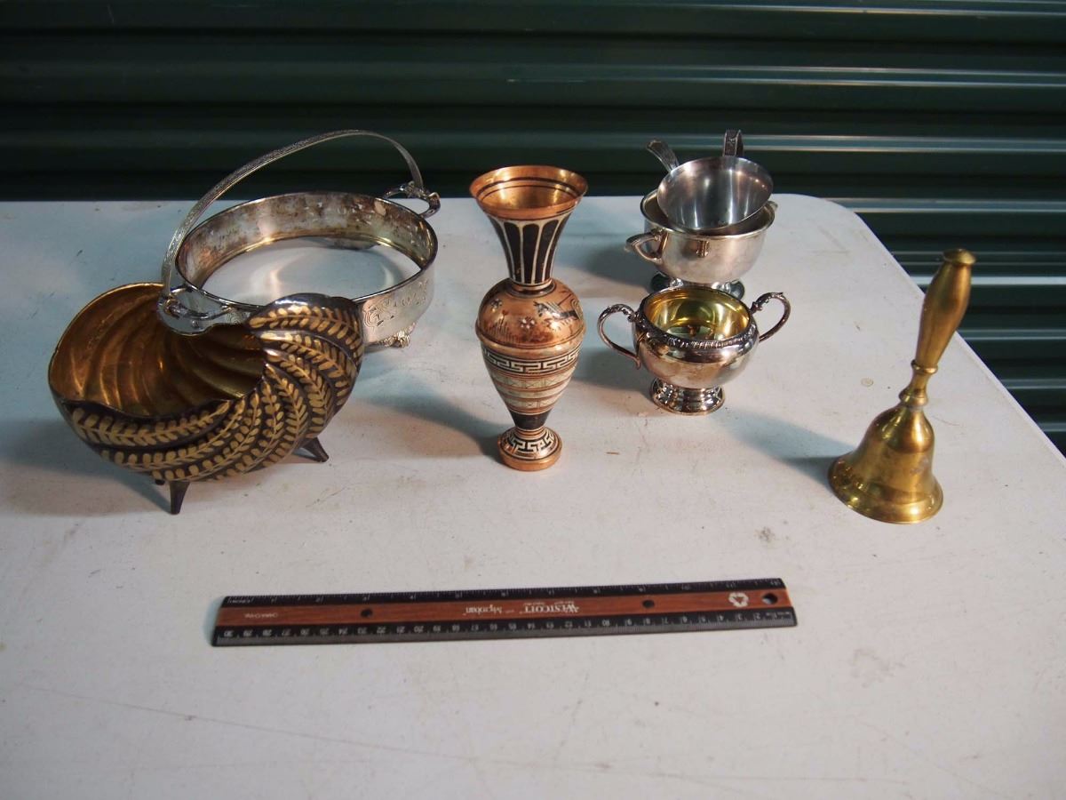 Lot of Metal Misc (Table Piece, Napkin Holder, Bell, Bowl and Spoon Set, Etc;)