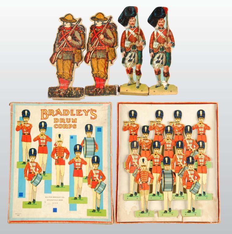 Description Circa 1890s to 1930s. This lot includes thirty-one McLoughlin "Highlanders" on wooden stands, and a group of ten Doughboys with nine wooden stands. Milton Bradley's "Drum Corp" has fourteen musicians on wooden stands playing a variety of instruments. No set is complete; all have flaws; all are in good condition.