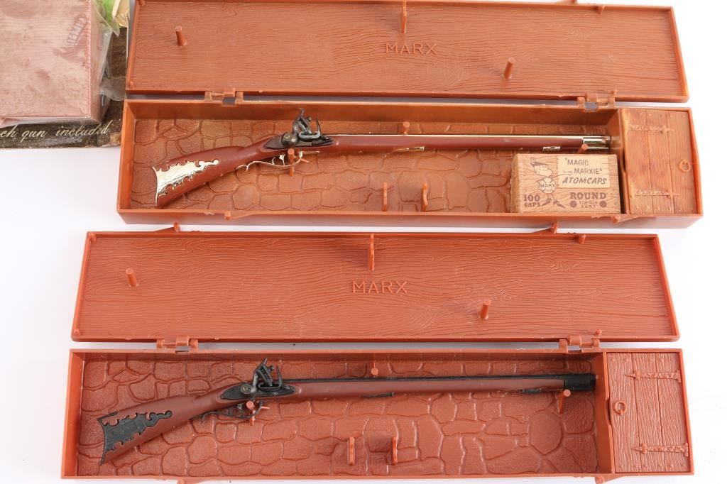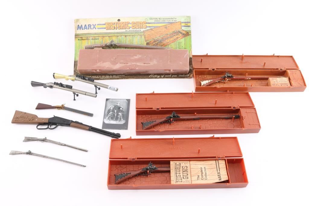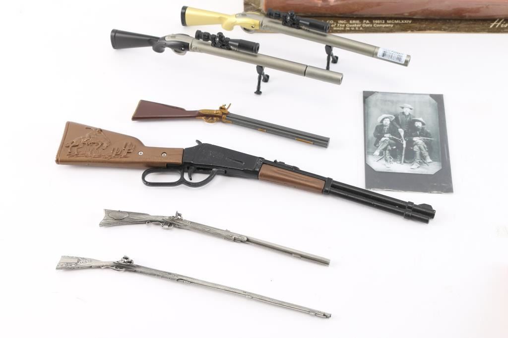 Includes: 4 - Marx Kentucky rifle, one in unopened packaging; 2 - pewter Kentucky rifles; 2 - sniper rifle pens; 1 - Winchester lever action rifle cap gun; 1 - Nock 6-barreled rifle & 1 - Western fridge magnet. All in good condition and measure less than 10 inches.