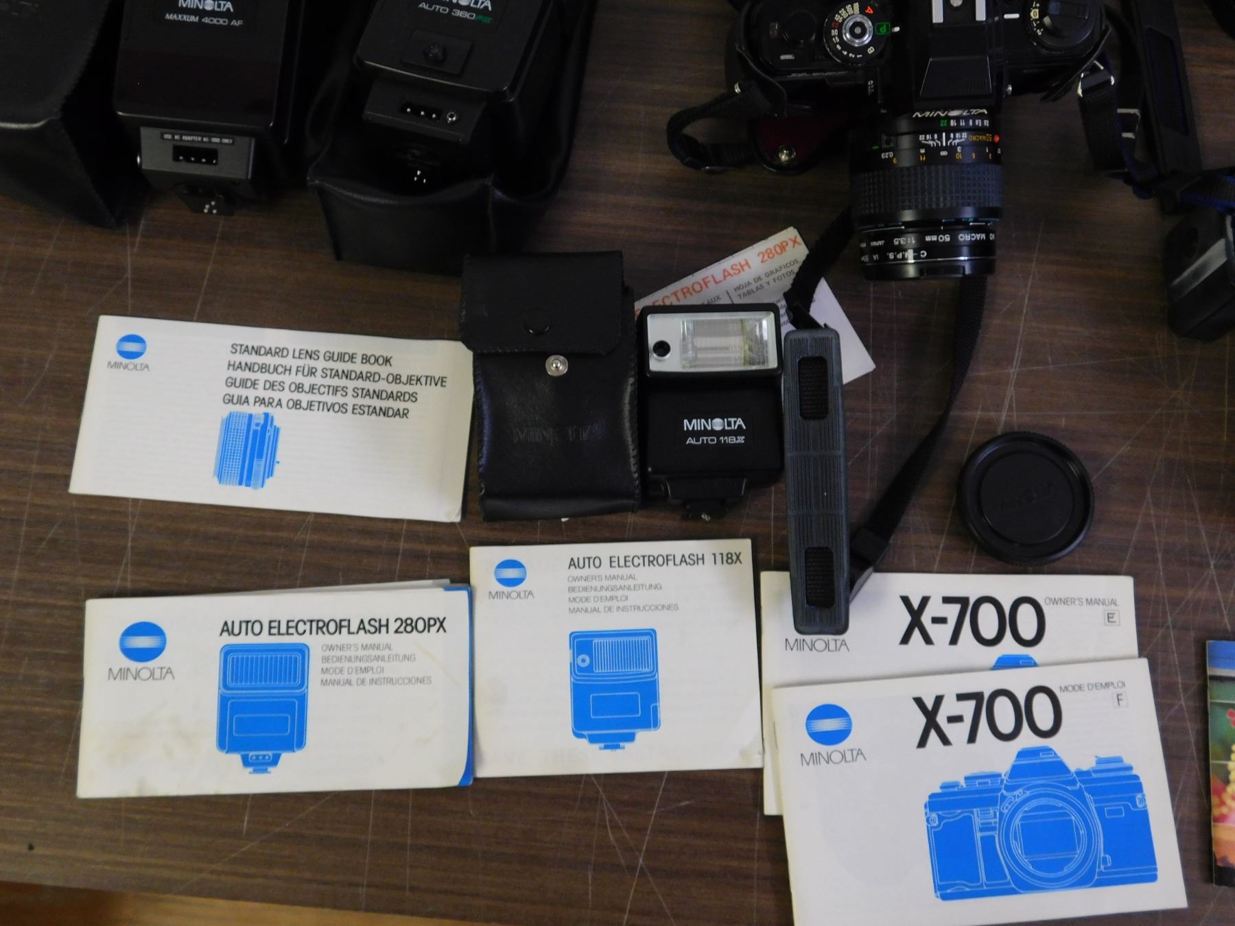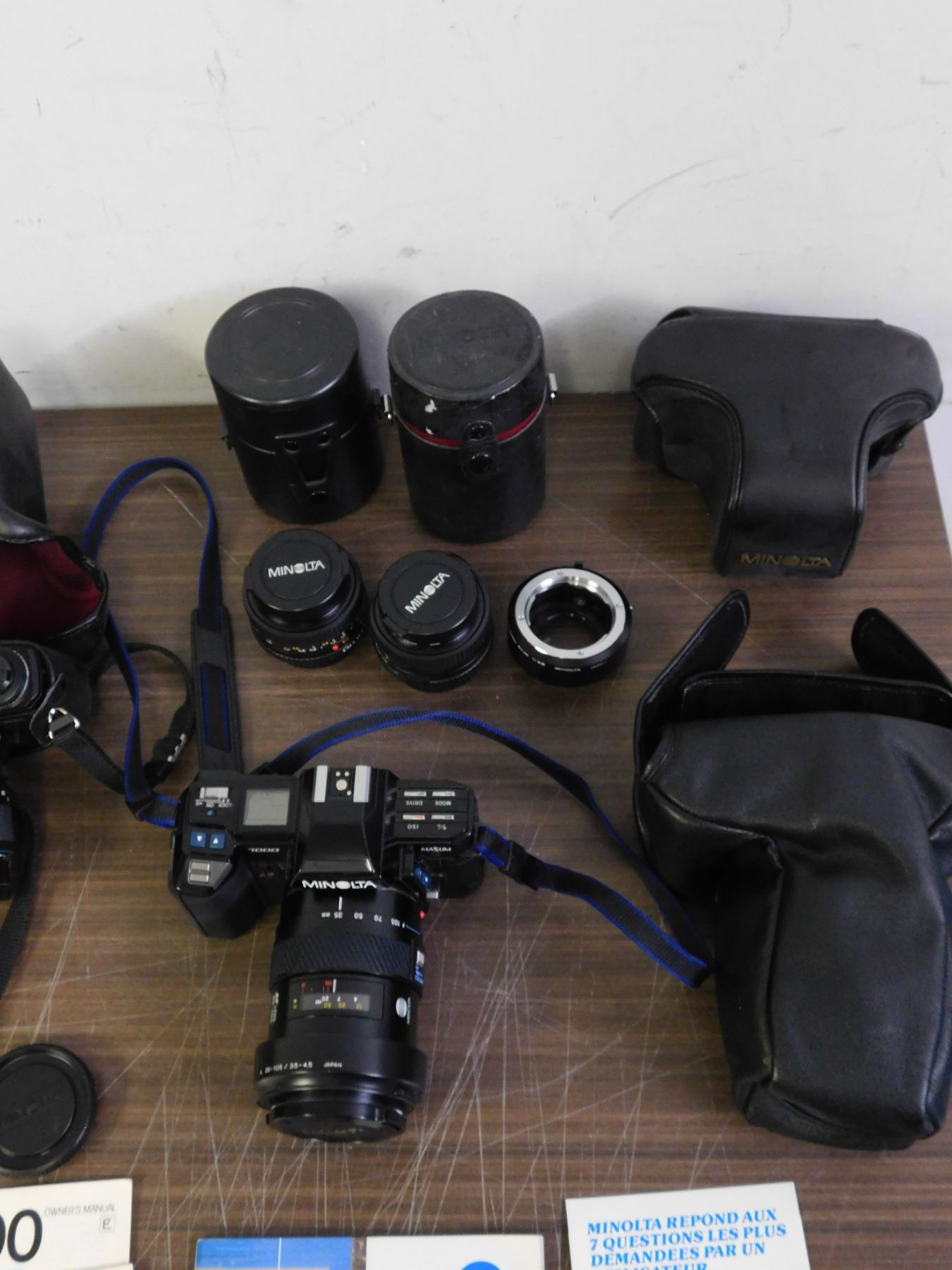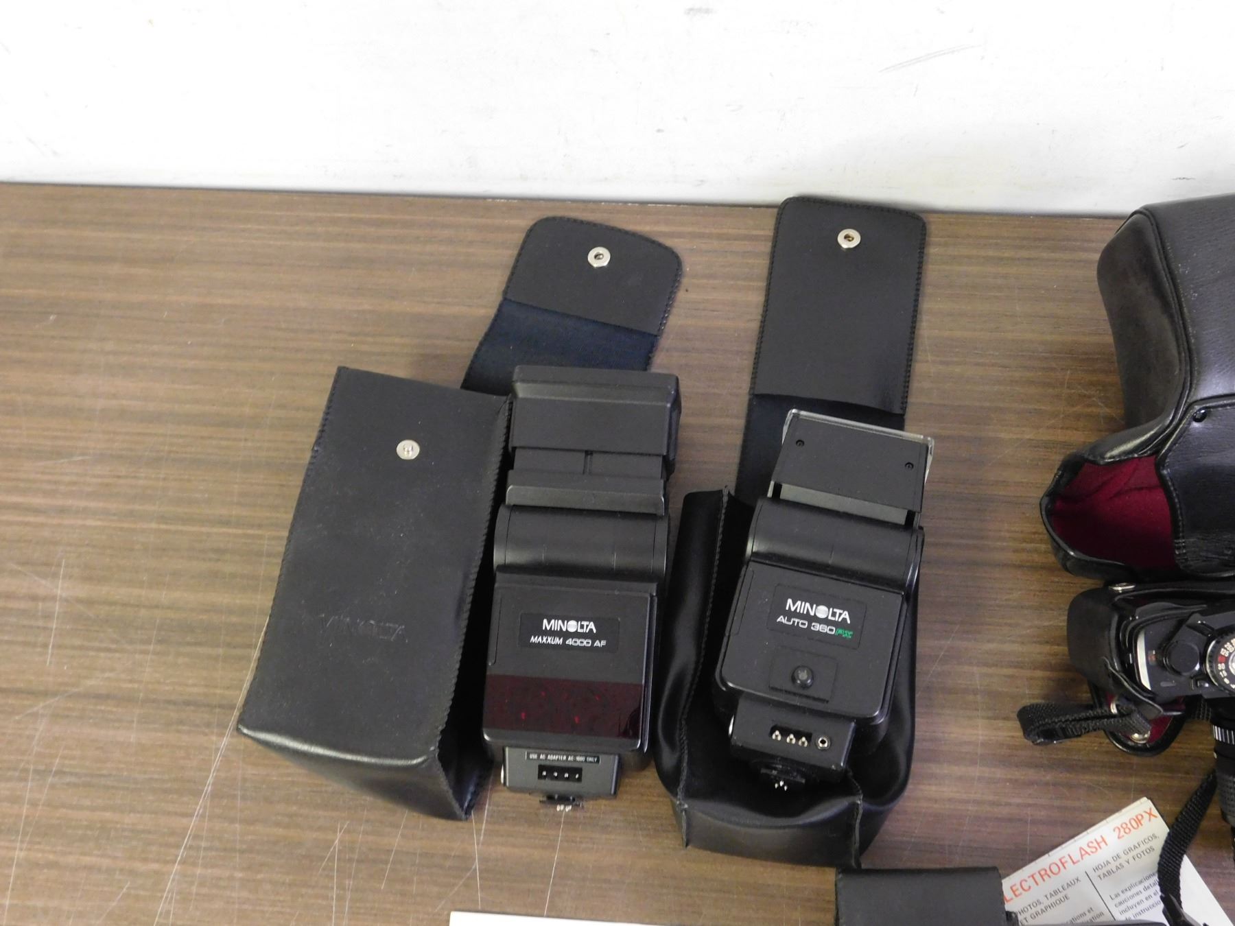 Lot of Minolta 2 Camera Bodies, 4 Lenses, 3 Flash, Adaptor & 2 Leather Cases, Paperwork