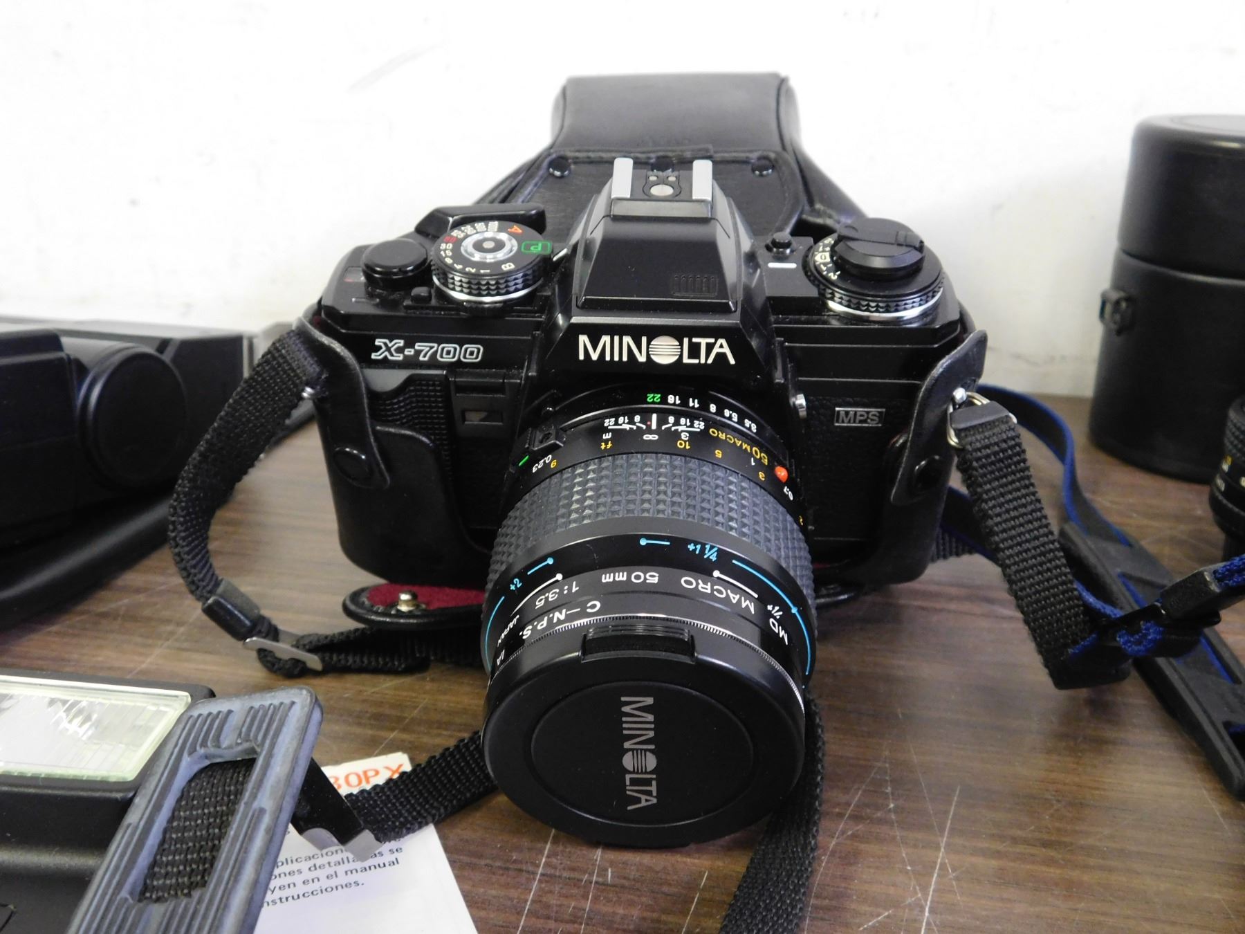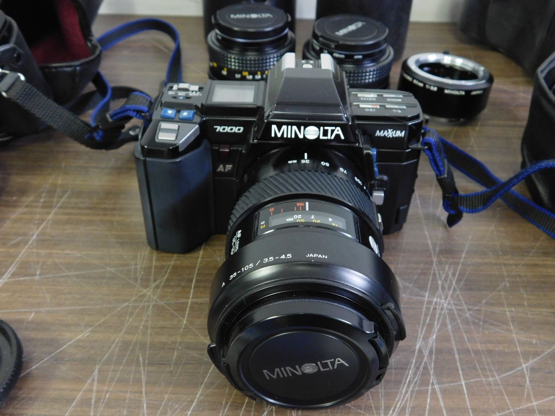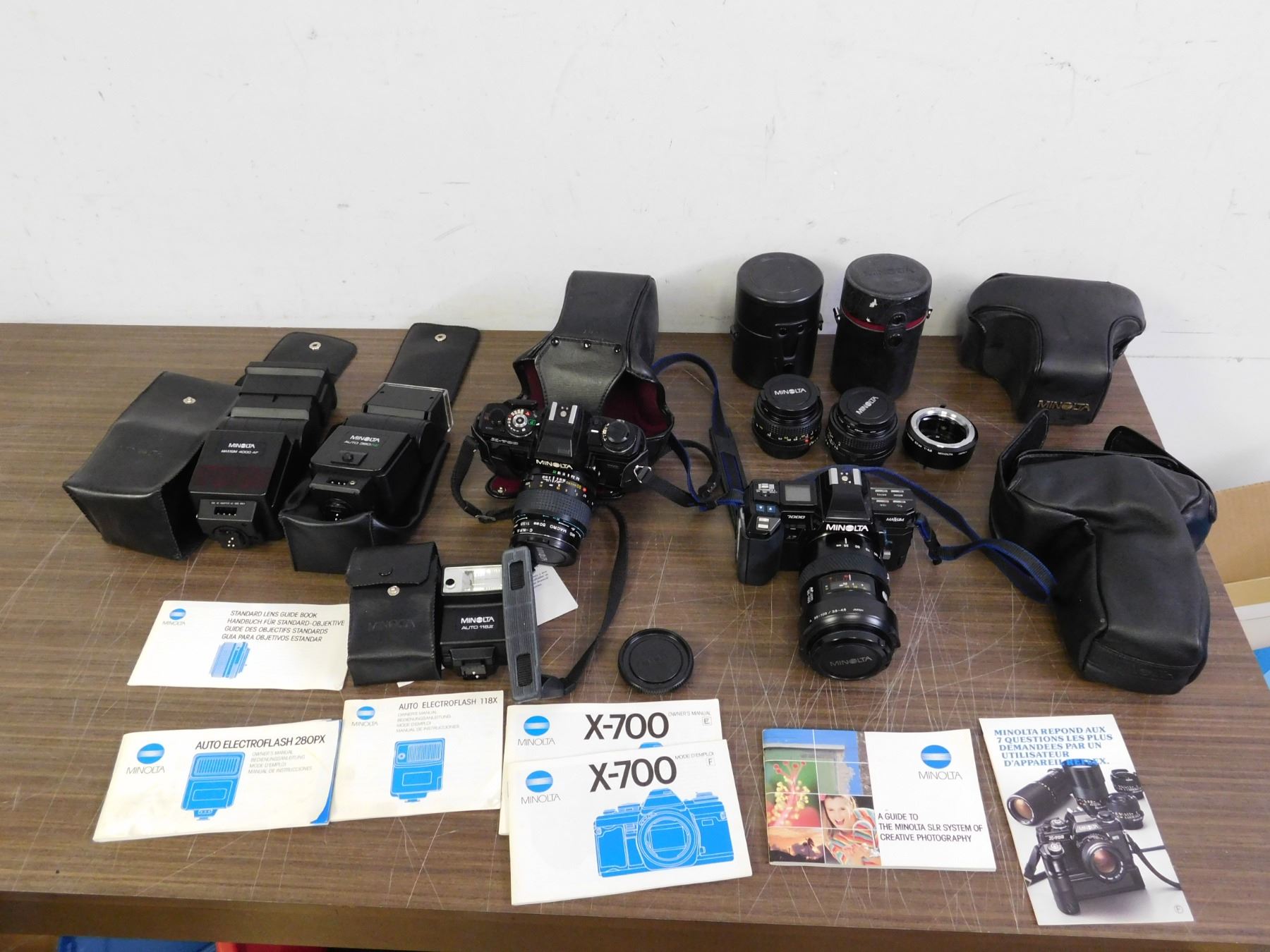 Lot of Minolta 2 Camera Bodies, 4 Lenses, 3 Flash, Adaptor & 2 Leather Cases, Paperwork
