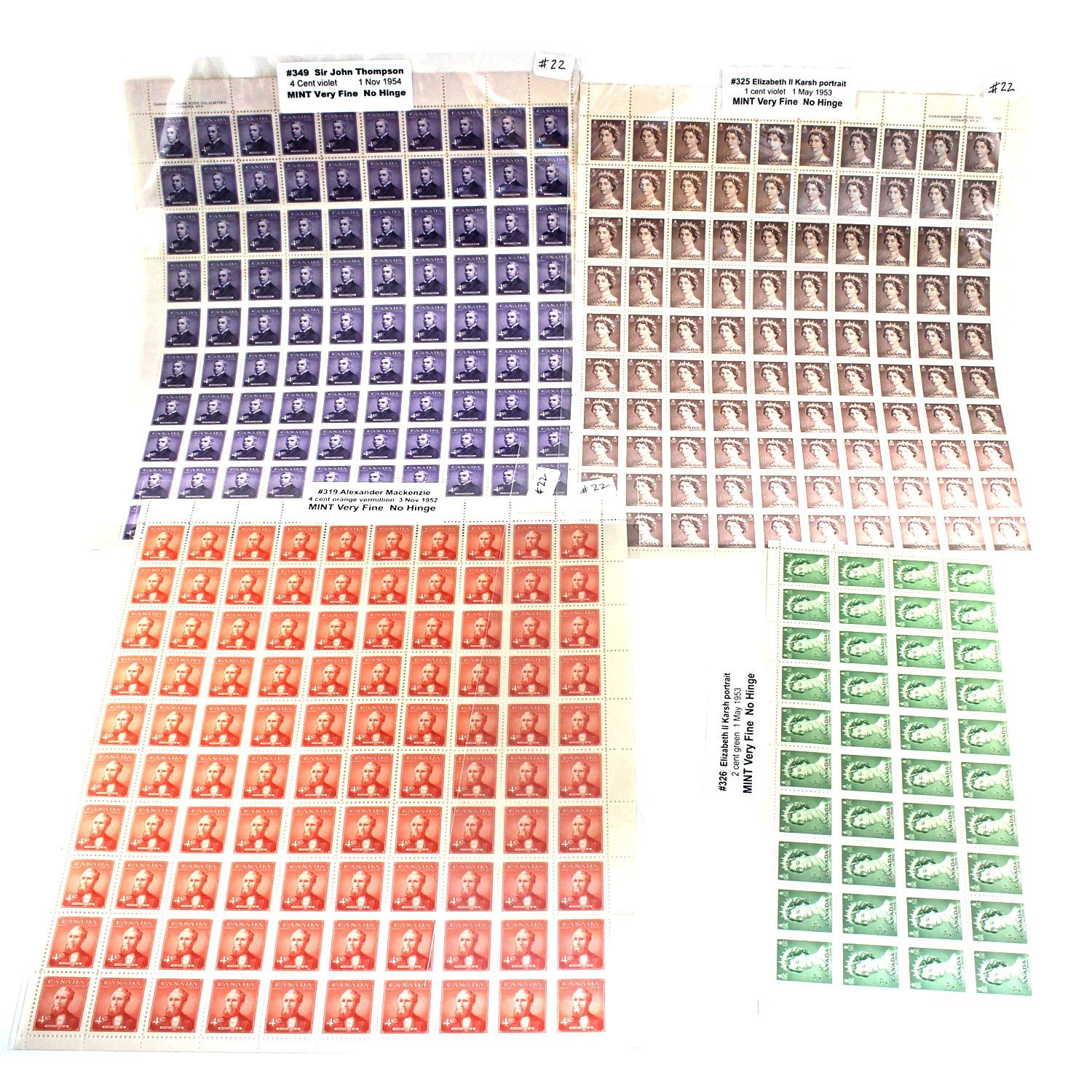Lot of Mint No Hinge Stamps in VF condition: #319 1952 Alexander Mackenzie 4c orange vermillion, #325 1953 Elizabeth II Karsh portrait 1c Violet, #349 1954 Sir John Thompson 4c violet & # 326 1953 Elizabeth II Karsh portrait 2c green.