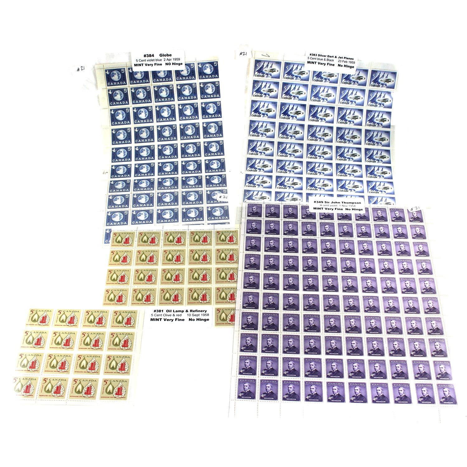 Lot of Mint No Hinge Stamps in VF condition: #349 1954 Sir John Thompson 4-cent Violet, #381 1958 Oil Lamp & Refinery 5-cent olive & red, #383 1959 Silver Dart & jet planes 5-cebt Blue & Black & #384 1959 Globe 5-cent Violet Blue.