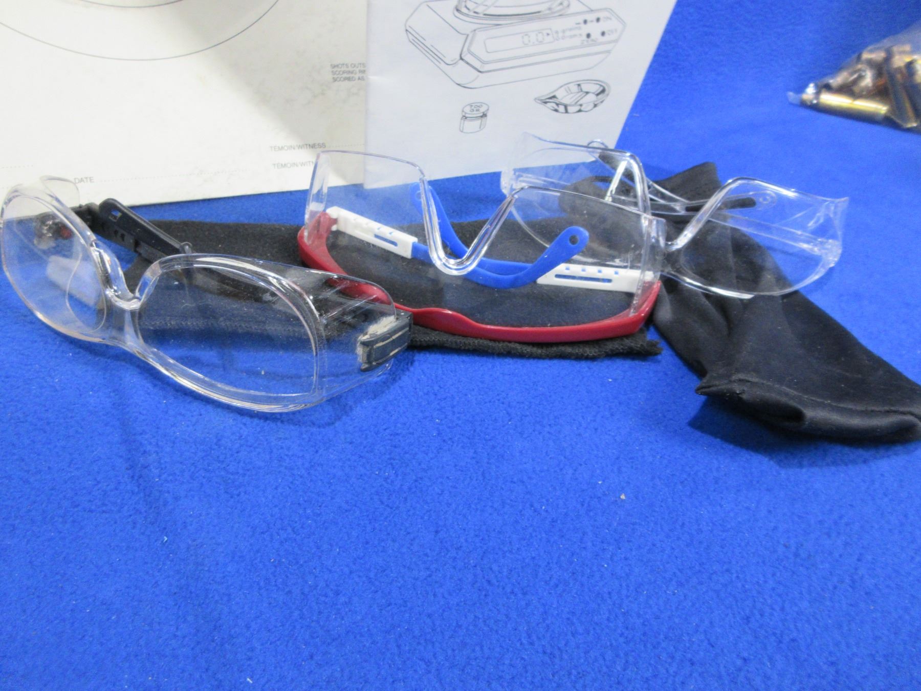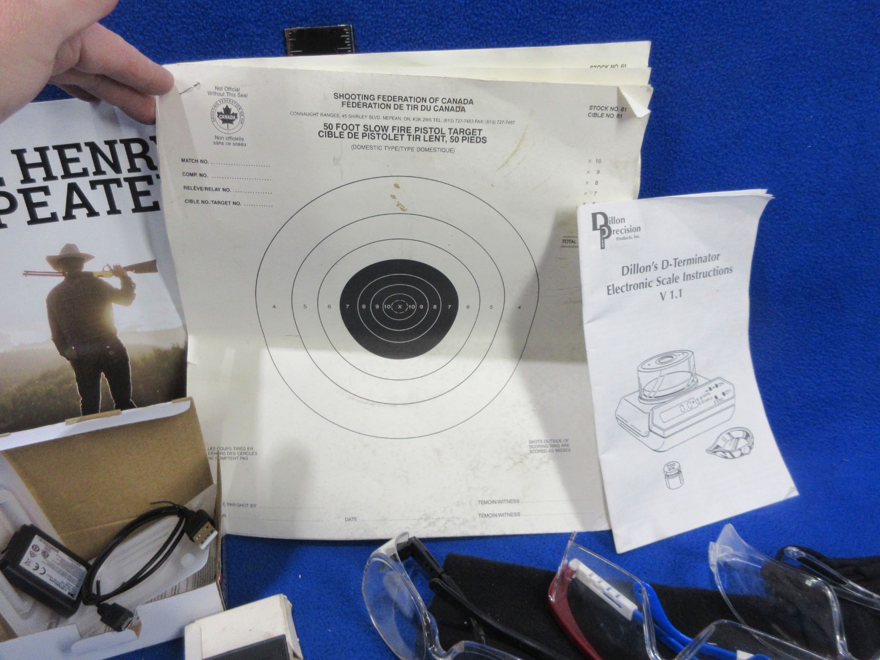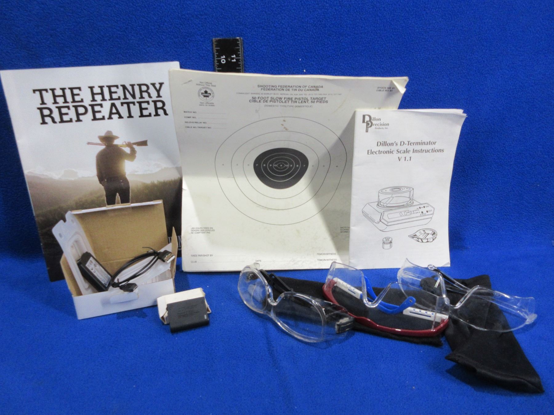 Lot of Misc. - 3 Pairs Shooting Glasses, 3M Alpha 1100 Rechargeable Battery (NEW) and FL 85R Rechargeable (Appears New), The Henry Repeater Magazine, Targets