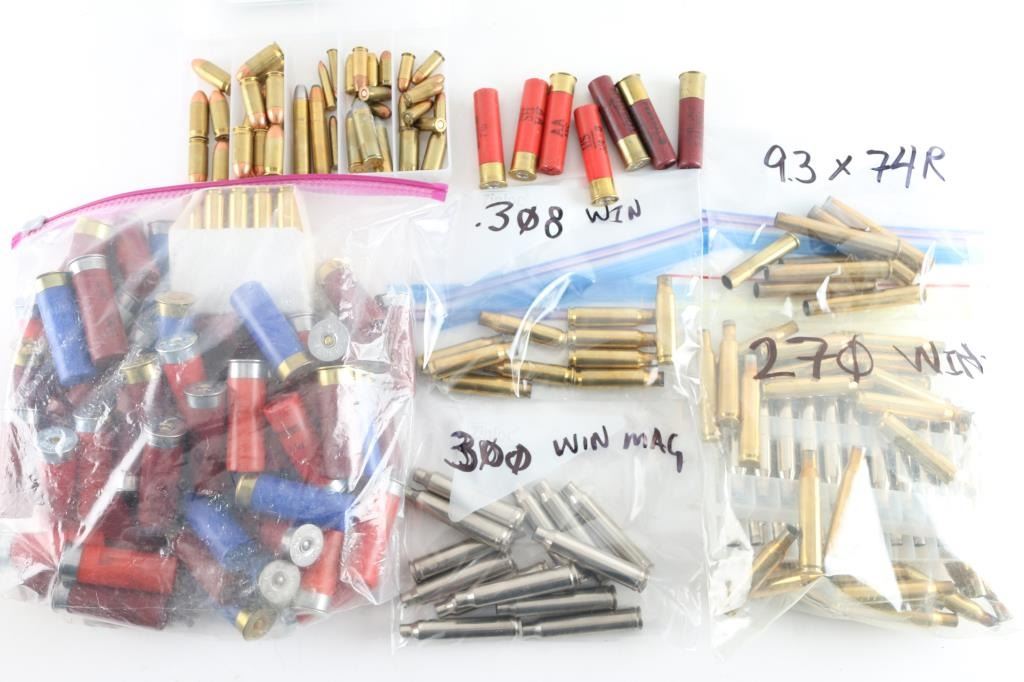 63 rnds - 12 Ga., 7 rnds 28 Ga. and handful of 45 auto, 380 auto and others. Includes 59 brass cases of 270 Win, 13 - 300 Win Mag, 10 - 308 Win, 6 - 9.3 X 74R.