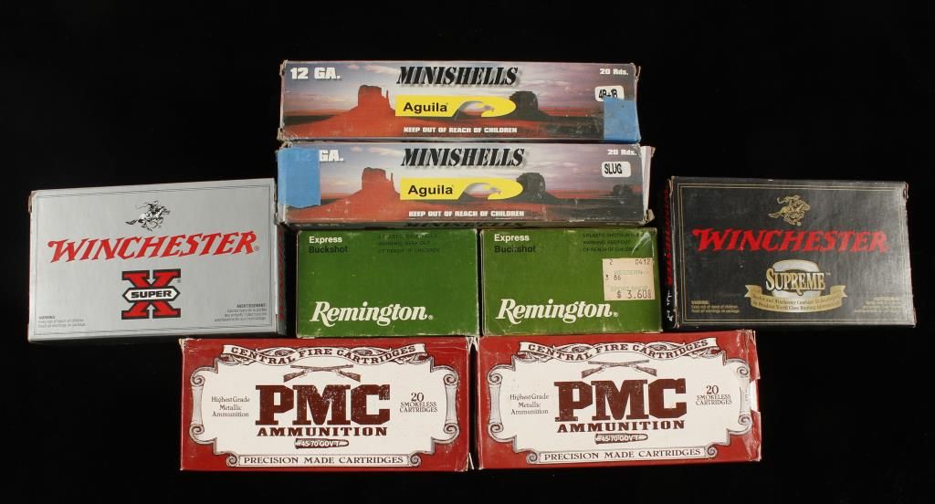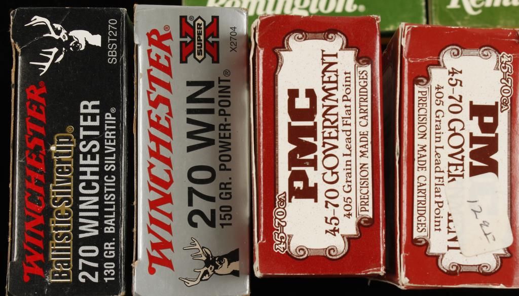 (40) PCM 45-70 Gov't 405 grain lead flat point. (20) Winchester .270 Win 150 grain power point. (20) Winchester .270 Win 130 grain Ballistic Silvertip. (20) Minishells Aguila 4B+1B. (20) Minishells Aguila slug.