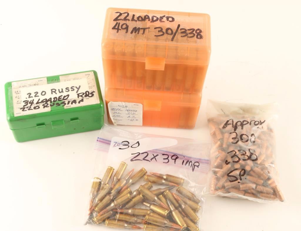 Including 22 rds of 30/338 factory loads, 49 rds of 30/338 brass, approximately 300 rds of .338 SP bullets, 30 rds of 22x39 IMP bullets, and 34 loaded rds of .220 Russian.