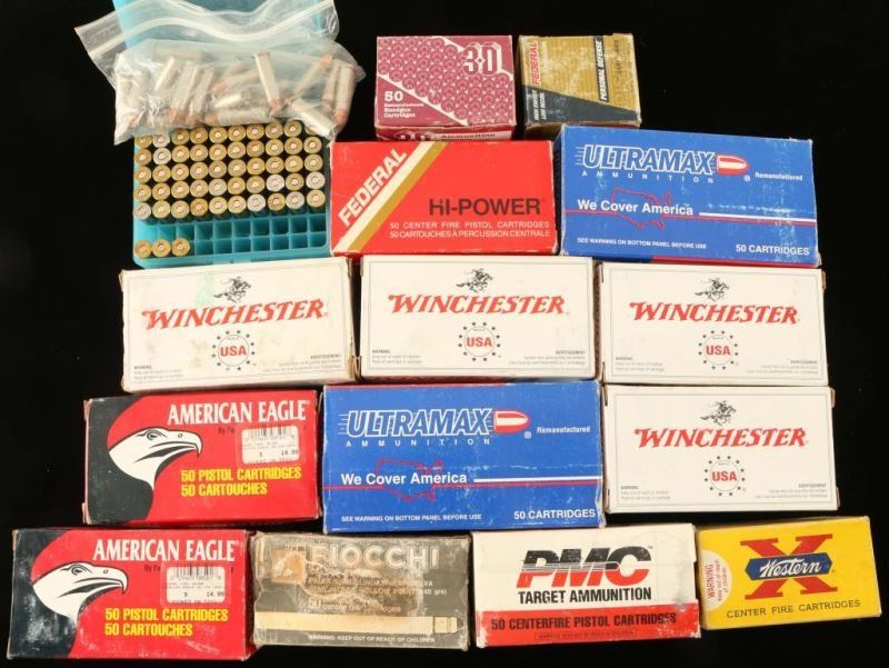 36 Rds of 38 Spl by Ultramax, 124 Rds 38 Spl by Winchester, 50 Rds 38 Spl by American Eagle, 36 Rds 357 Mag by Winchester, 50 Rds 38 Spl by Ultramax, 9 Rds 357 Mag by PMC, 50 Rds reloaded 38 Spl by Winchester, 34 Rds 38 Spl by Fiocchi, 40 Rds 38 Spl by American Eagle, Misc. 38 Spl brass, 32 Rds 38 Spl by Federal, bag of loose misc 38 Spl.