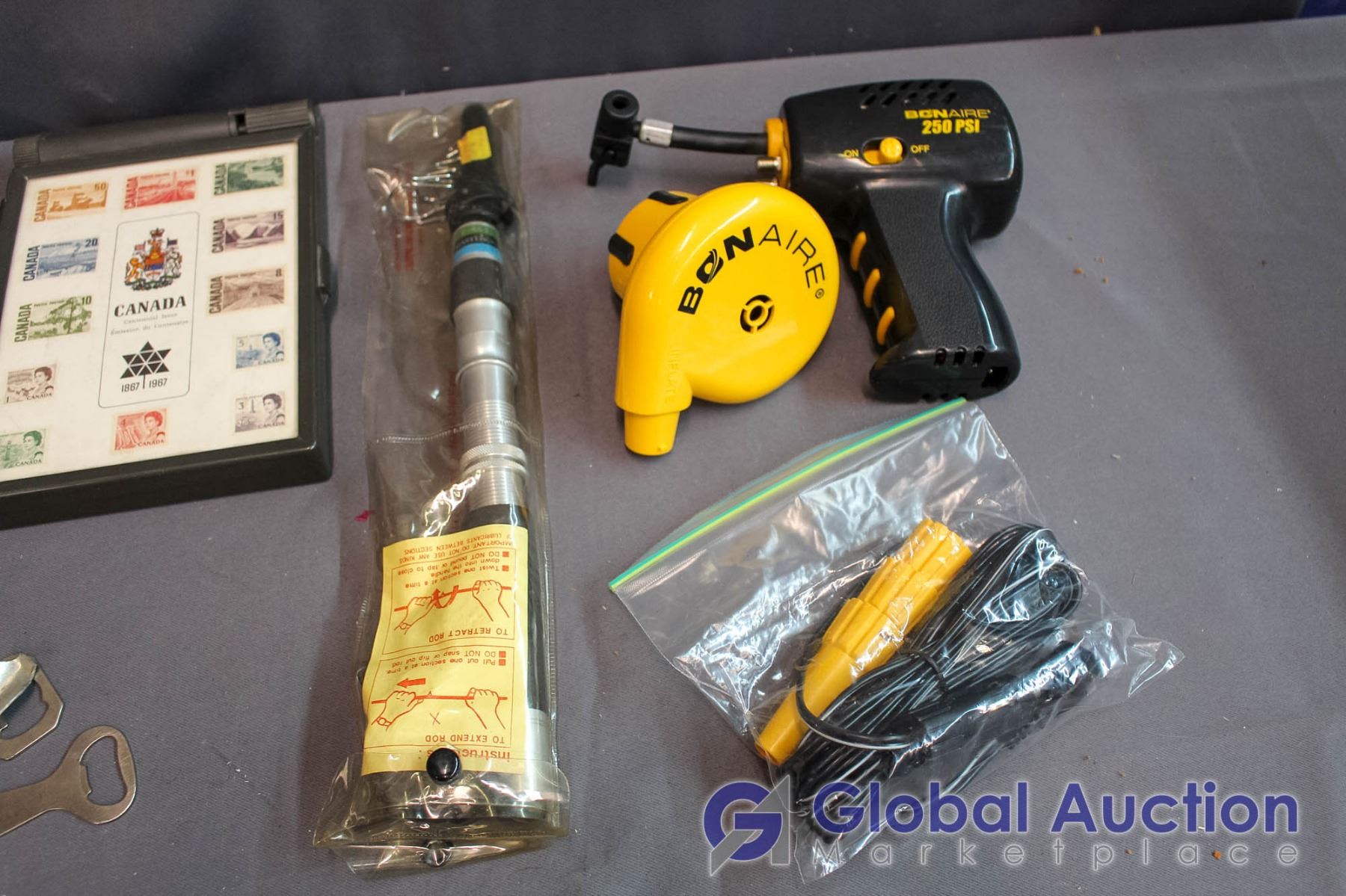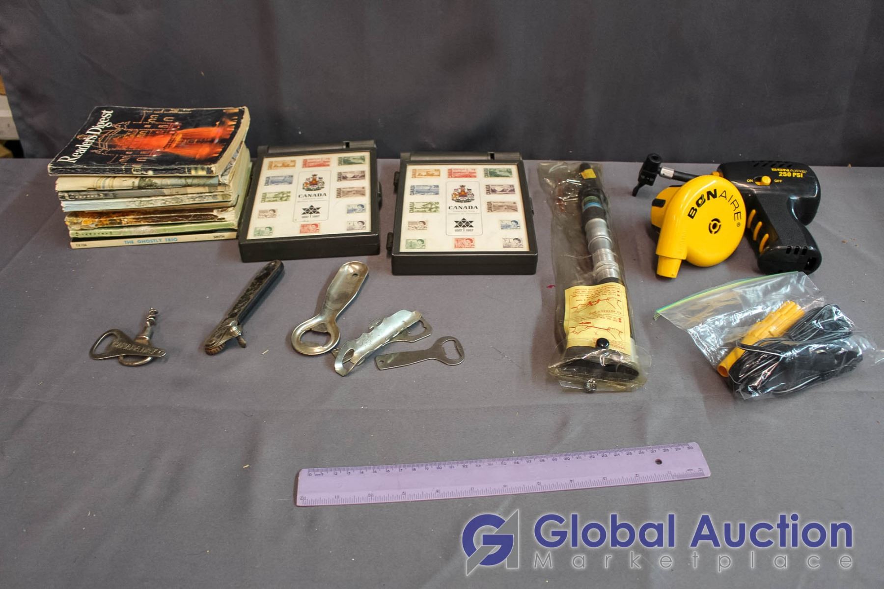 Lot of Misc (Bionaire 250 psi Inflator, Misc Hardware, Vintage Readers Digest, Canada Stamps)