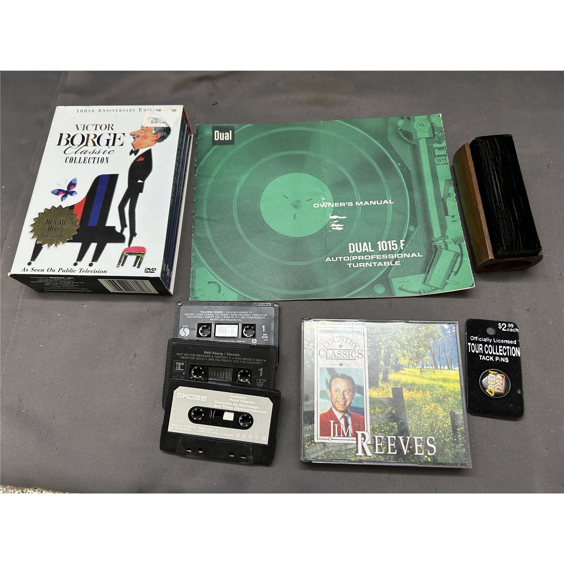 Lot of Misc Cassette Tapes, Record Cleaner, CD, Pin, Turntable Manual