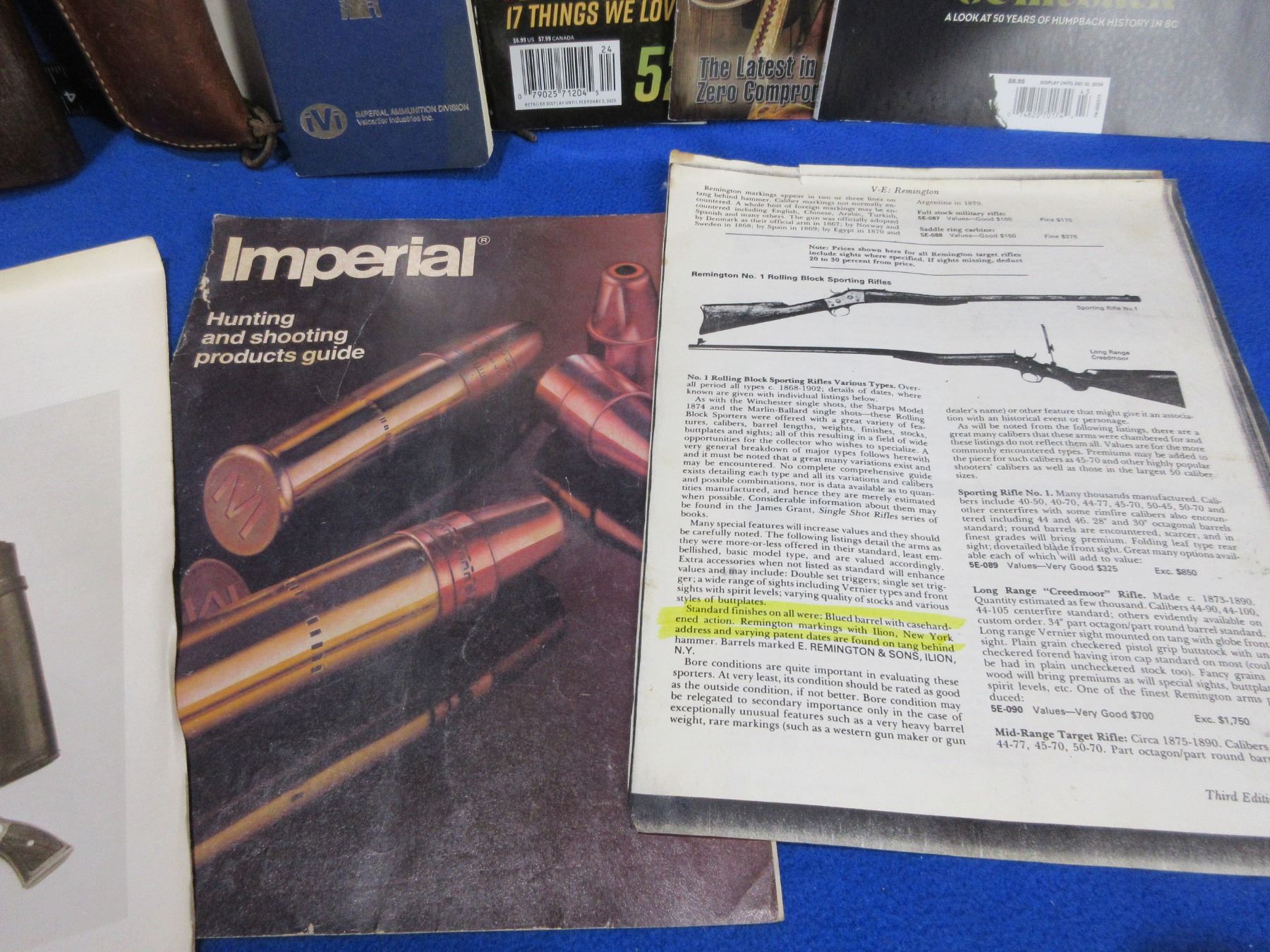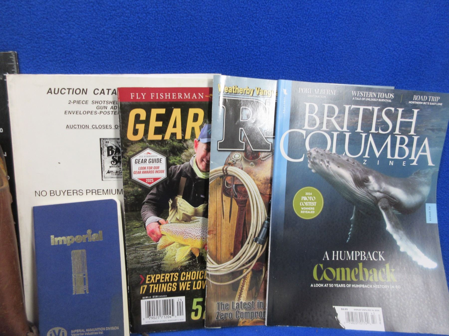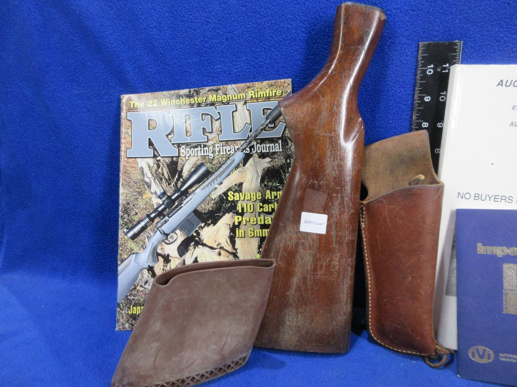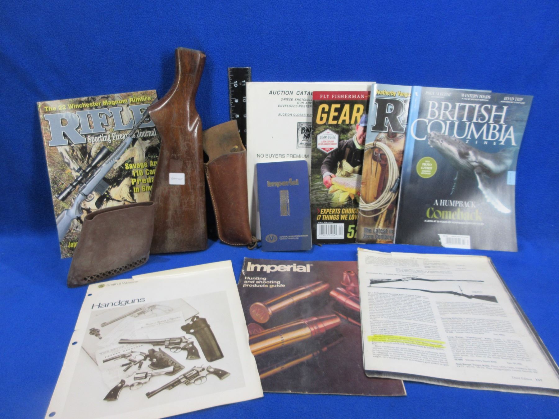 Lot of Misc. - Catalogs, Calendar, Holster, Stock, Recoil Pad, Etc. - Imperial Ammunition Division 1981 Calendar, 4 Magazines, 1992 Auction Catalog and 2 Product Guides, Leather RH Holster 95 Scout, Slip-On Recoil Pad & Shotgun Stock (Damaged)