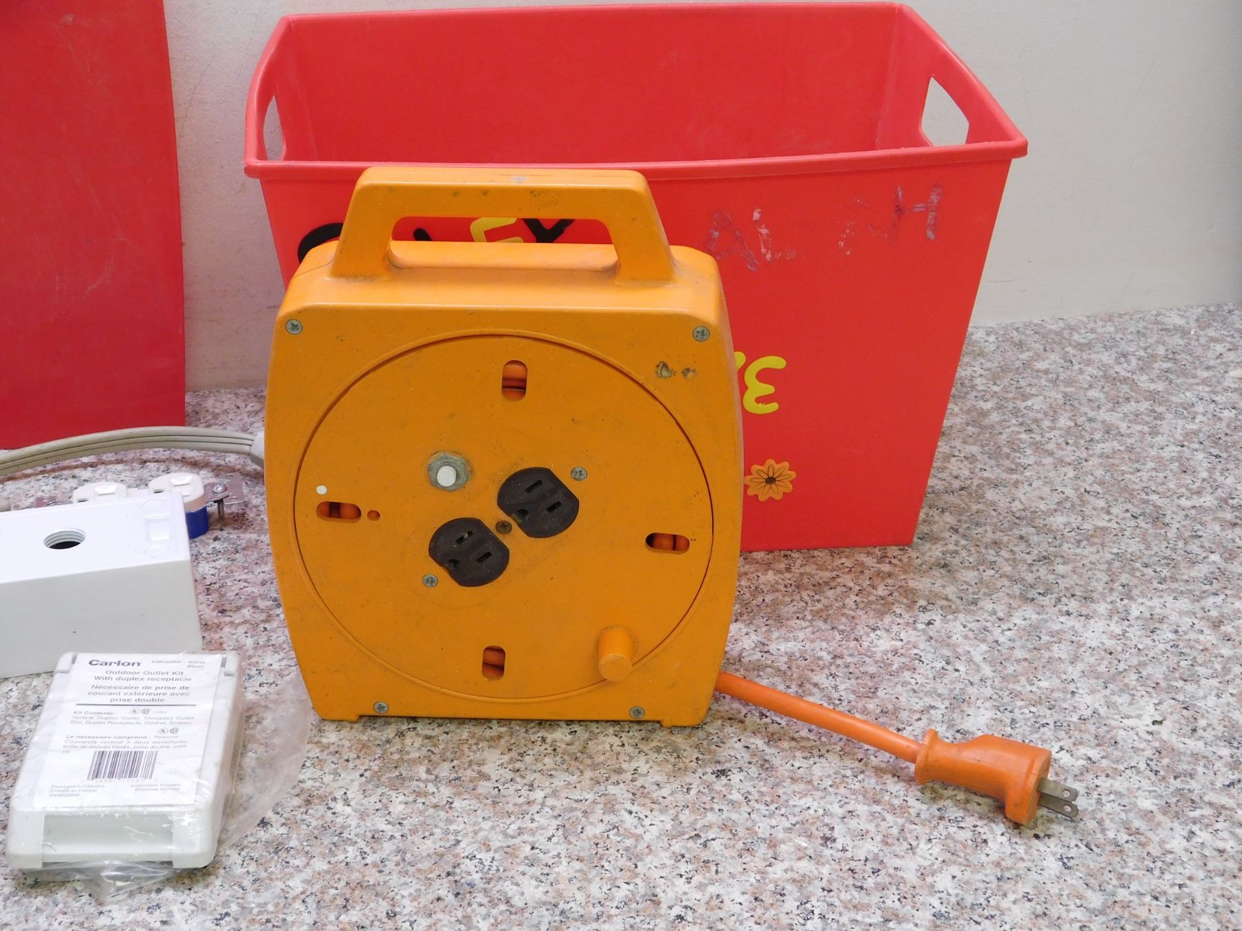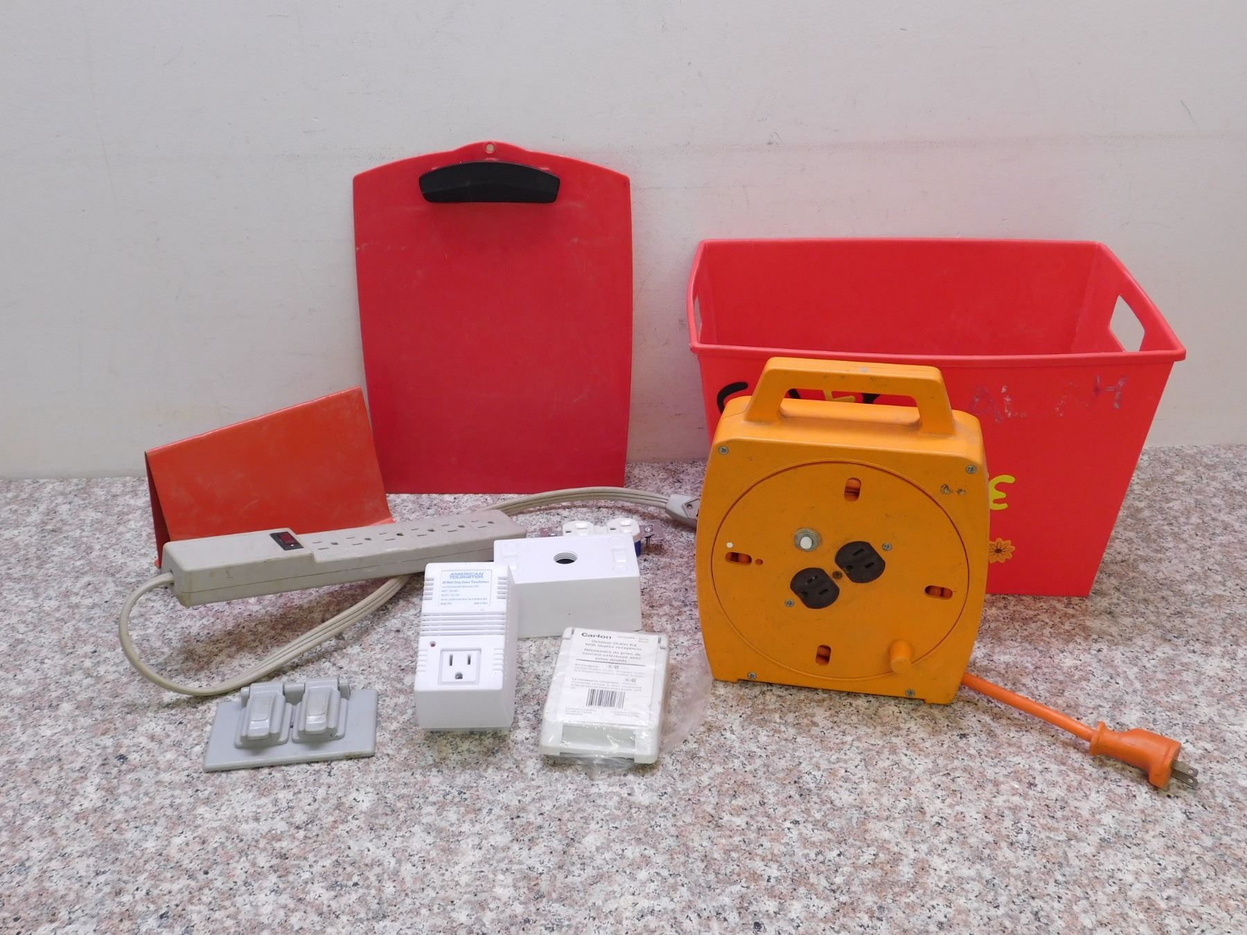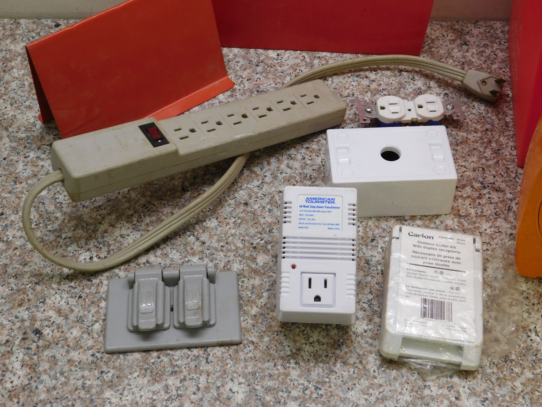 Lot of Misc Electric Items Power Bar, Step Down Transformer, Outdoor Outlet Kit, Extension Cable,