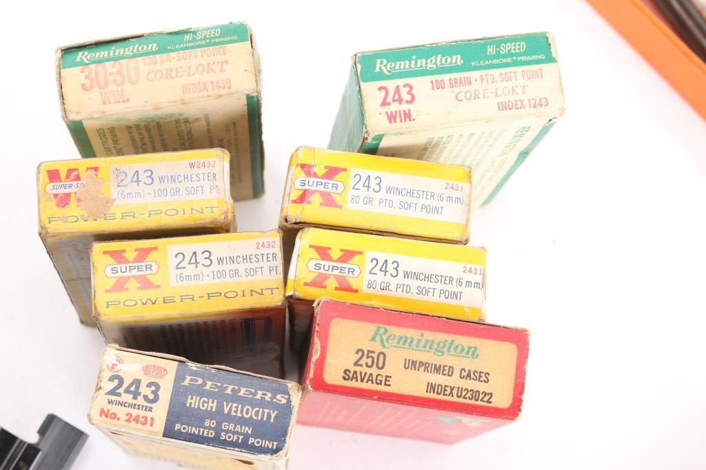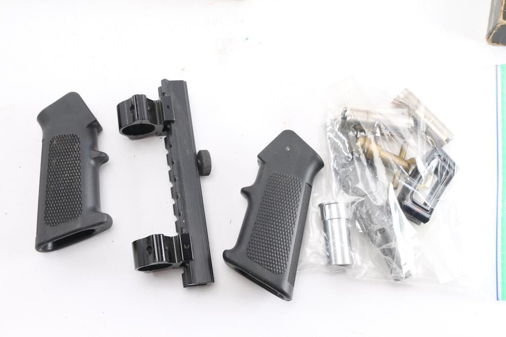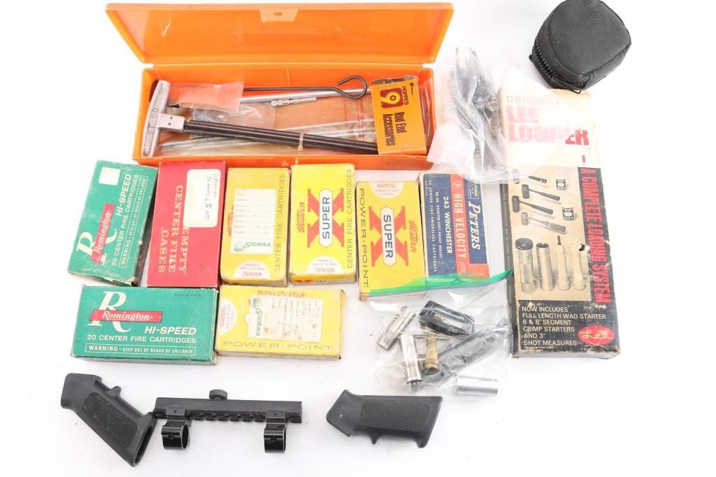 Includes: 2 - AR15/M4 pistol grips, 1 - Scope rail/riser for AR15/M4 handle w/scope rings, 2 - pairs of Glock fingertip extensions for 10mm/45 Colt Super and 9mm/40 S&W magazines, 1 - Original Lee Loader(complete loading system) kit, 3 - pairs of cleaning rods w/unused bore and barrel brushes for .223/5.56, in Hoppes case, 1 - M4/M16 Otis cleaning kit, multiple cleaning pads and more, approx. 100 spent shell casings for .243 Win and approx. 20 for 30-30 & 250 Savage.